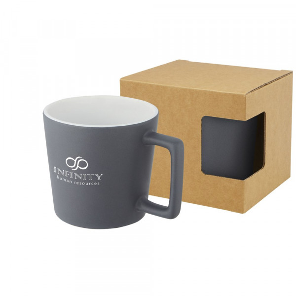 Keramiktasse mit modernem Design und matter Oberfläche. Das Fassungsvermögen beträgt 370 ml. Spülmaschinenfest für alle Dekorationsmethoden. Präsentiert in einer Geschenkbox aus Recyclingkarton.