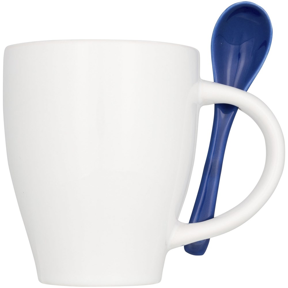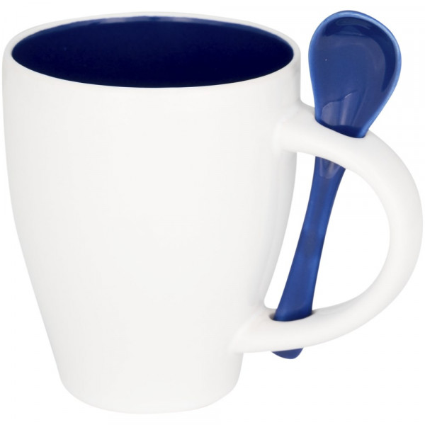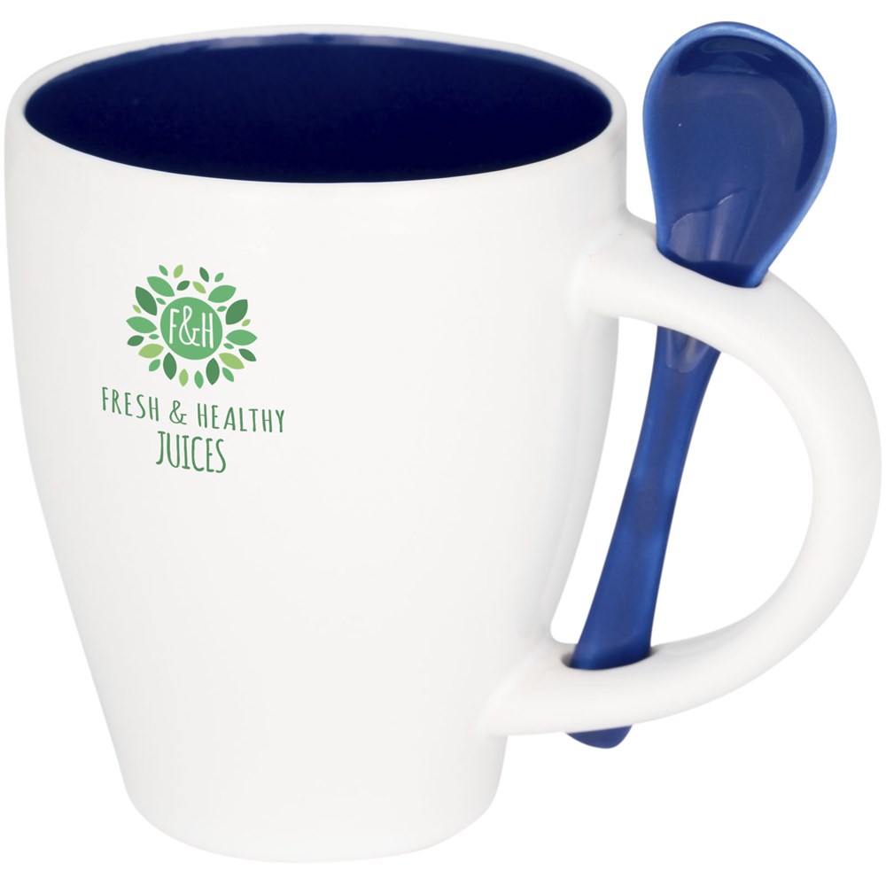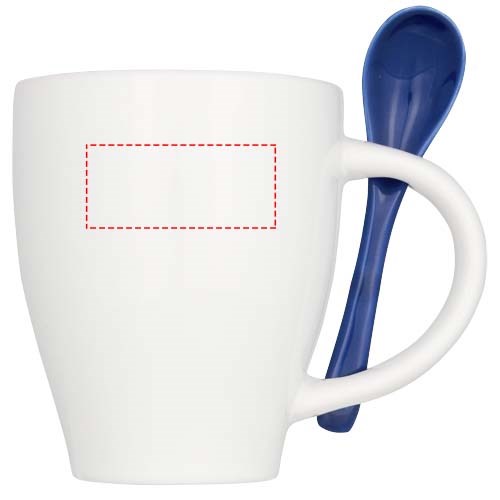 Keramiktasse mit einem modischen Design und integriertem Löffelhalter im Griff. Die Innenseite der Tasse ist gefärbt und kommt mit einem farblich passenden Löffel. Spülmaschinenfest EN12875-1 konform (bei bis zu 125 Waschvorgängen) für alle Werbeanbringungsmethoden. Fassungsvermögen beträgt 250ml. Präsentiert in einer weißen Kartonschachtel.