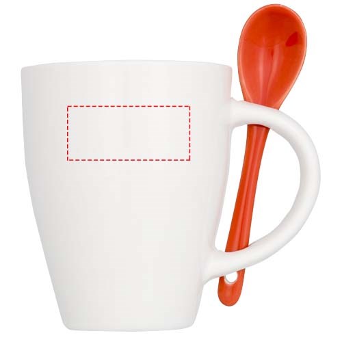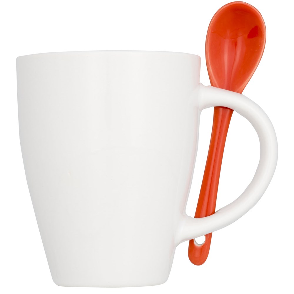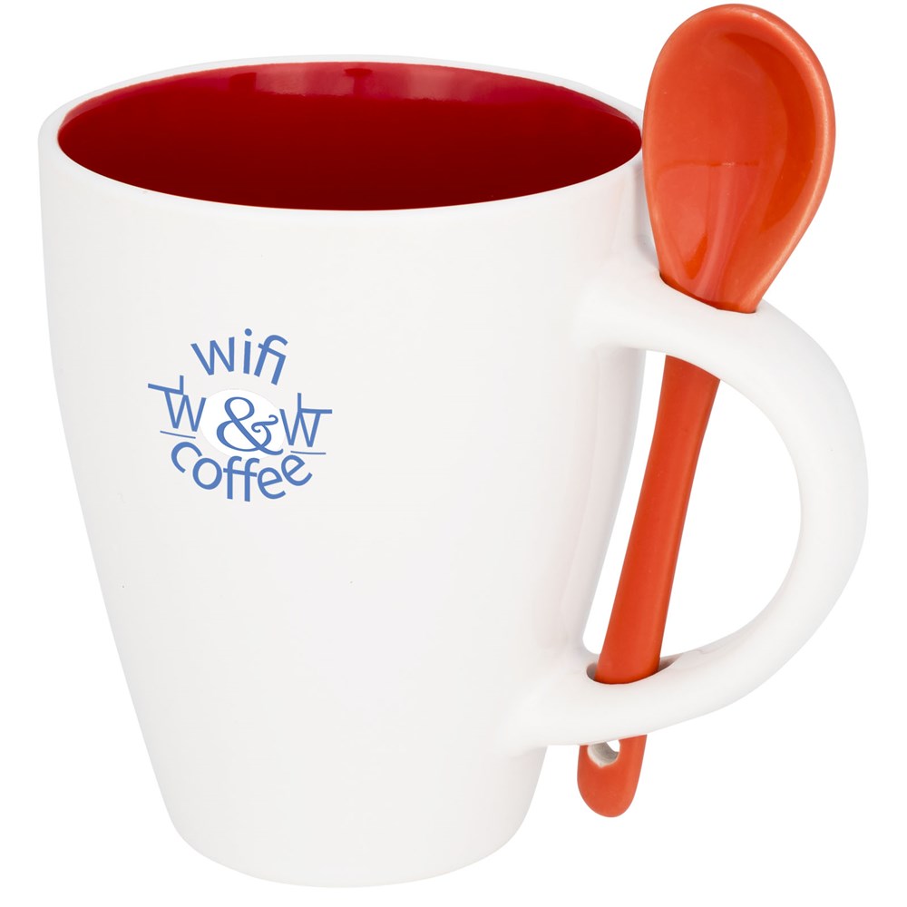 Keramiktasse mit einem modischen Design und integriertem Löffelhalter im Griff. Die Innenseite der Tasse ist gefärbt und kommt mit einem farblich passenden Löffel. Spülmaschinenfest EN12875-1 konform (bei bis zu 125 Waschvorgängen) für alle Werbeanbringungsmethoden. Fassungsvermögen beträgt 250ml. Präsentiert in einer weißen Kartonschachtel.
