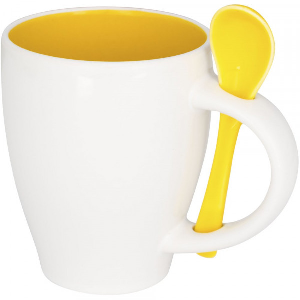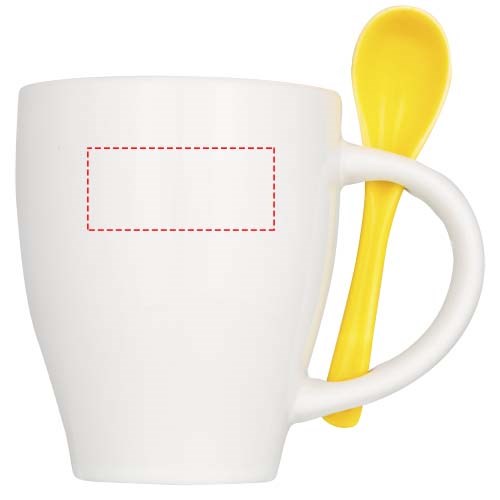 Keramiktasse mit einem modischen Design und integriertem Löffelhalter im Griff. Die Innenseite der Tasse ist gefärbt und kommt mit einem farblich passenden Löffel. Spülmaschinenfest EN12875-1 konform (bei bis zu 125 Waschvorgängen) für alle Werbeanbringungsmethoden. Fassungsvermögen beträgt 250ml. Präsentiert in einer weißen Kartonschachtel.