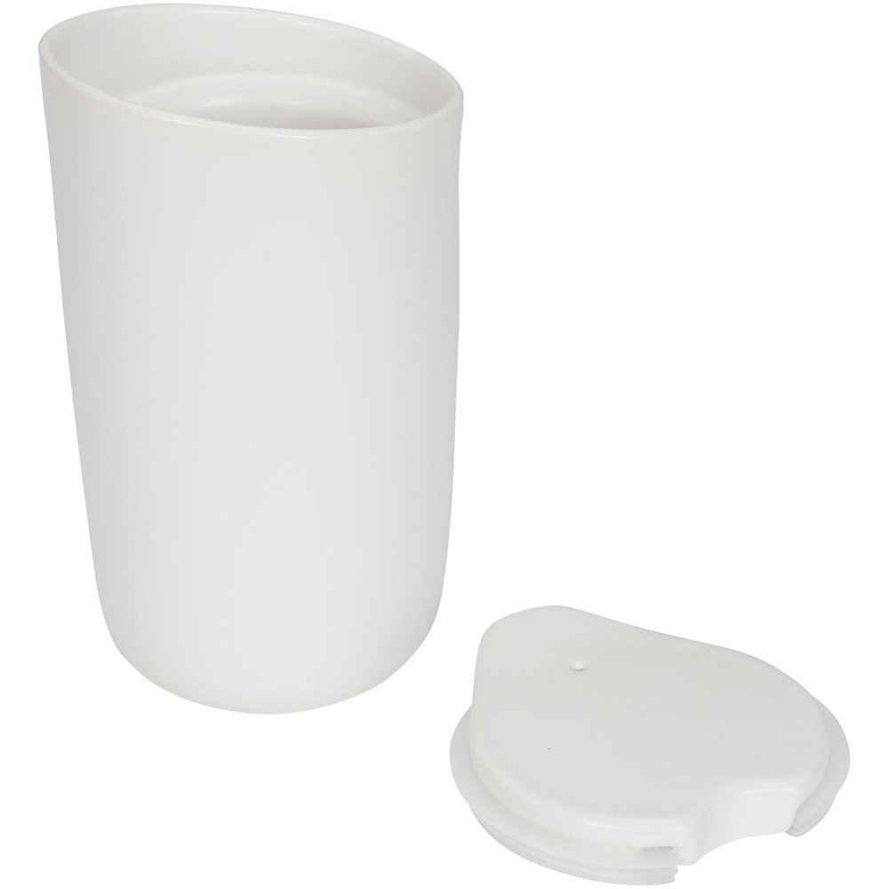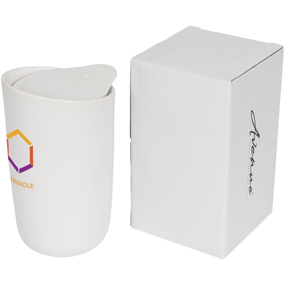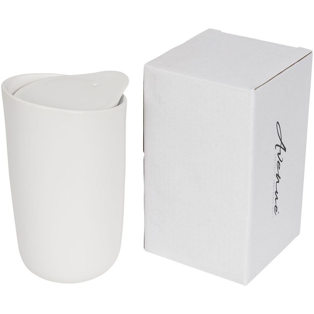 Schnuckeliger doppelwandiger Keramikbecher mit Keramikdeckel. Passt unter die meisten Kaffeemaschinen und ist mikrowellengeeignet. Entfernen Sie vor dem Stellen in die Mikrowelle die Silikondichtung am Keramikdeckel. Spülmaschinenfest EN12875-1 konform (bei bis zu 125 Waschvorgängen) für alle Werbeanbringungsmethoden. Fassungsvermögen 400ml. In einem Avenue-Geschenkkarton präsentiert.