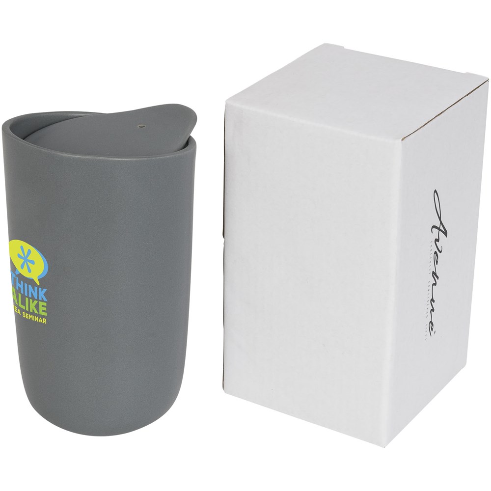 Schnuckeliger doppelwandiger Keramikbecher mit Keramikdeckel. Passt unter die meisten Kaffeemaschinen und ist mikrowellengeeignet. Entfernen Sie vor dem Stellen in die Mikrowelle die Silikondichtung am Keramikdeckel. Spülmaschinenfest EN12875-1 konform (bei bis zu 125 Waschvorgängen) für alle Werbeanbringungsmethoden. Fassungsvermögen 400ml. In einem Avenue-Geschenkkarton präsentiert.