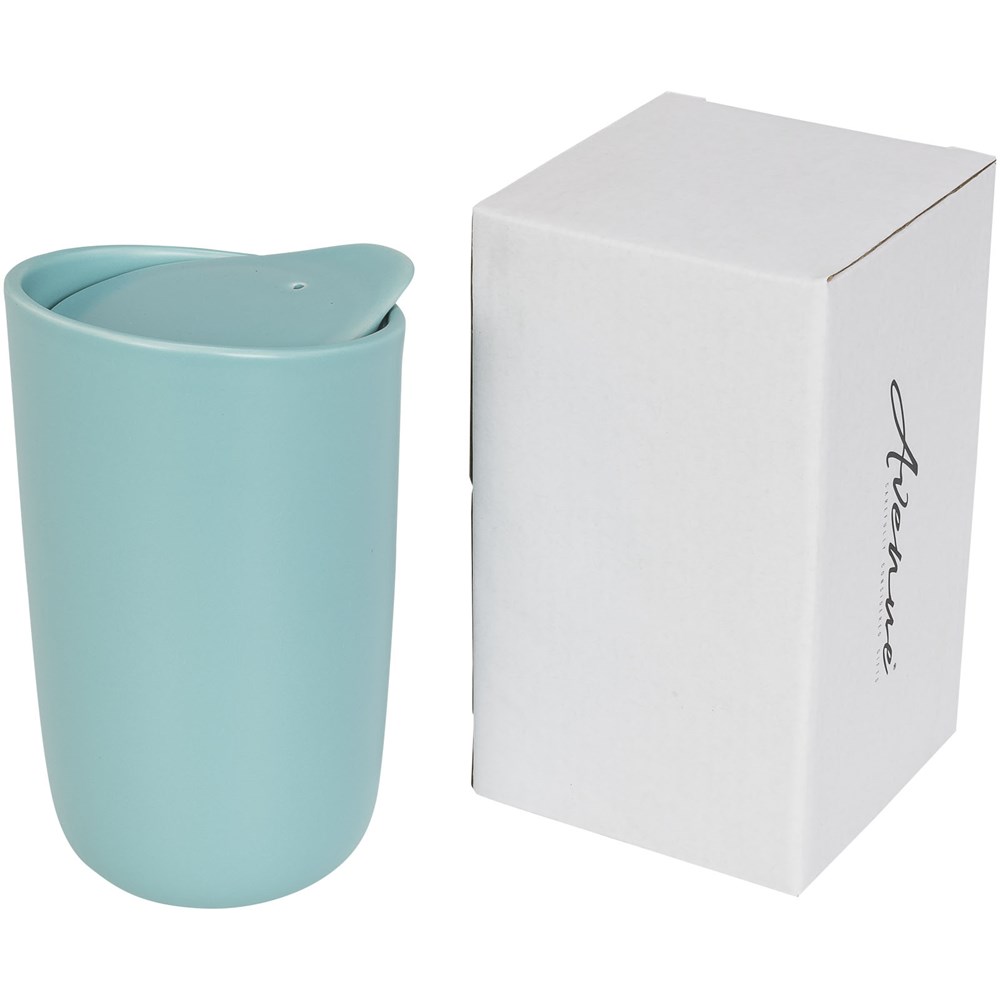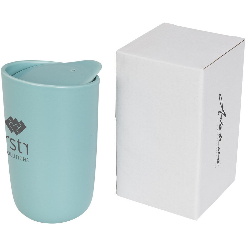 Schnuckeliger doppelwandiger Keramikbecher mit Keramikdeckel. Passt unter die meisten Kaffeemaschinen und ist mikrowellengeeignet. Entfernen Sie vor dem Stellen in die Mikrowelle die Silikondichtung am Keramikdeckel. Spülmaschinenfest EN12875-1 konform (bei bis zu 125 Waschvorgängen) für alle Werbeanbringungsmethoden. Fassungsvermögen 400ml. In einem Avenue-Geschenkkarton präsentiert.