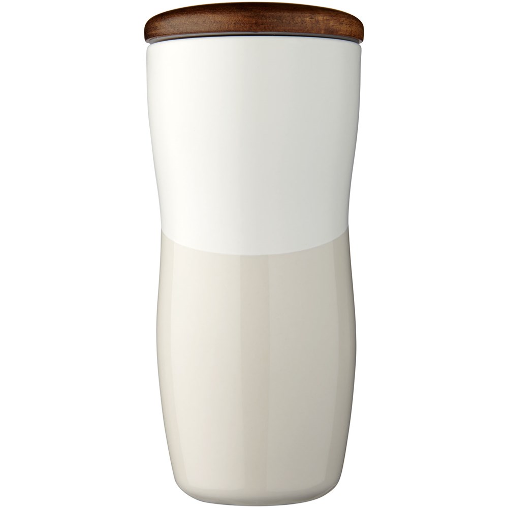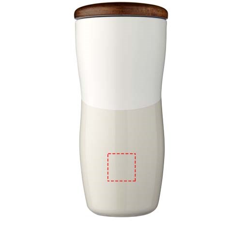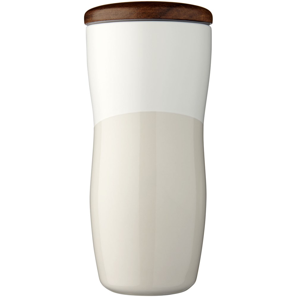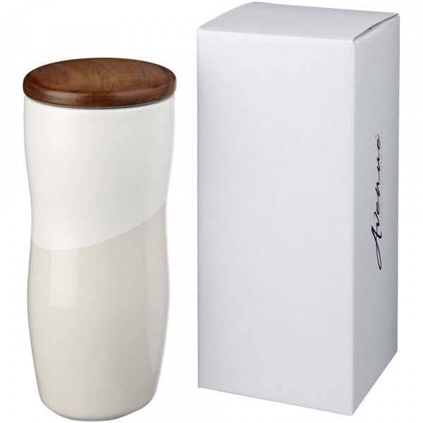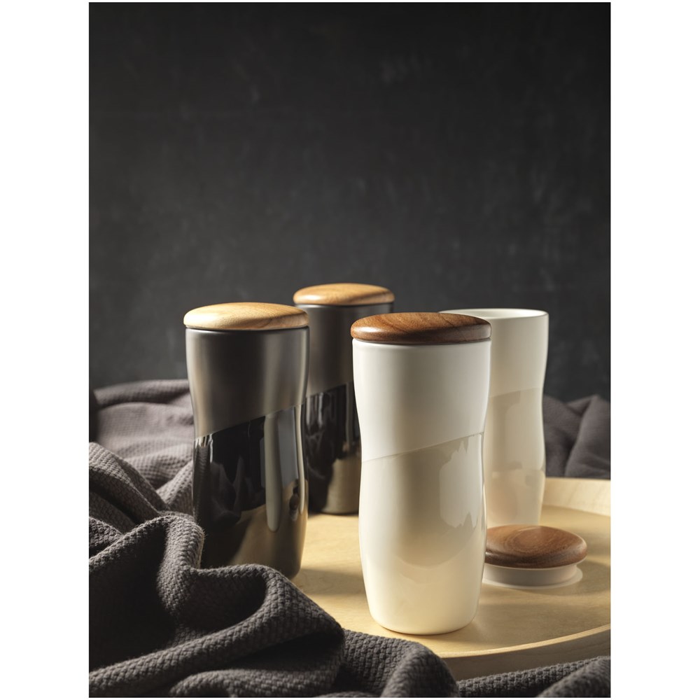 Doppelwandiger Keramikbecher mit mattem und glänzendem Kontrastdesign. Die Konstruktion verhindert außerdem Kondenswasser auf der Außenseite des Bechers. Ausgestattet mit einem aufsteckbaren Holzdeckel. Spülmaschinenfest EN12875-1 konform (bei bis zu 125 Waschvorgängen) für alle Werbeanbringungsmethoden. Das Fassungsvermögen beträgt 370ml. Präsentiert in einer Avenue-Geschenkschachtel.