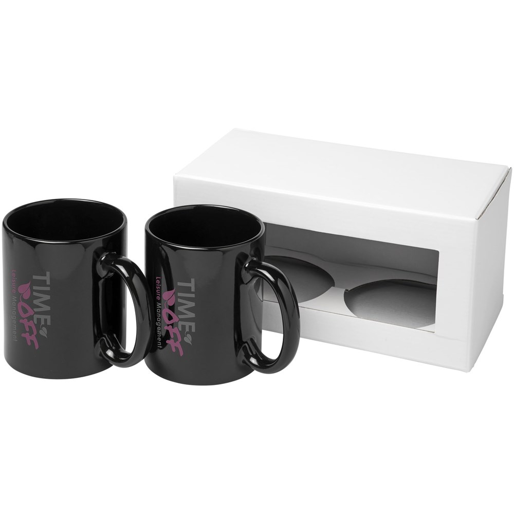 Geschenkset mit zwei keramischen 330-ml-Bechern. Präsentiert in einer weißen Geschenkbox mit durchsichtigem Fenster.