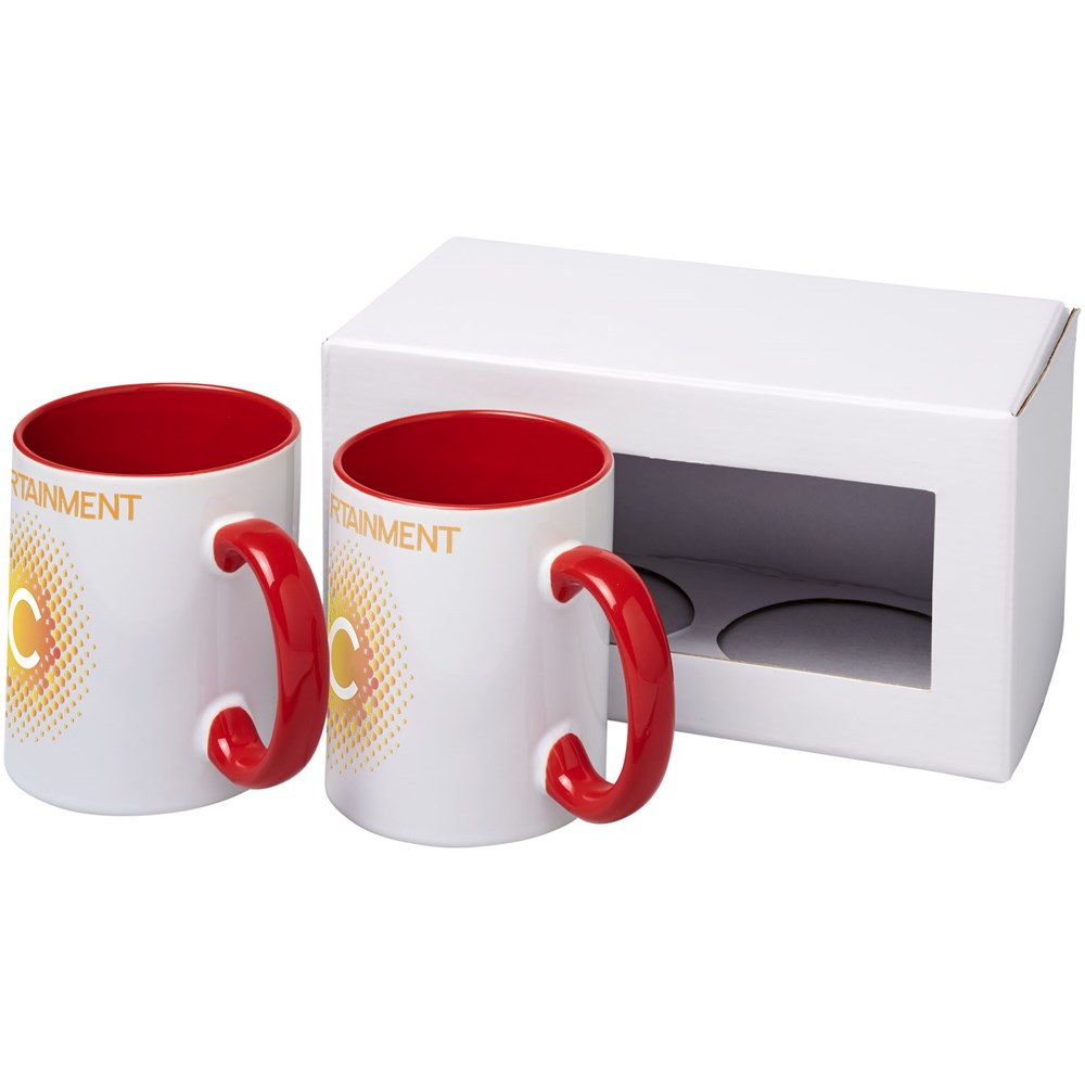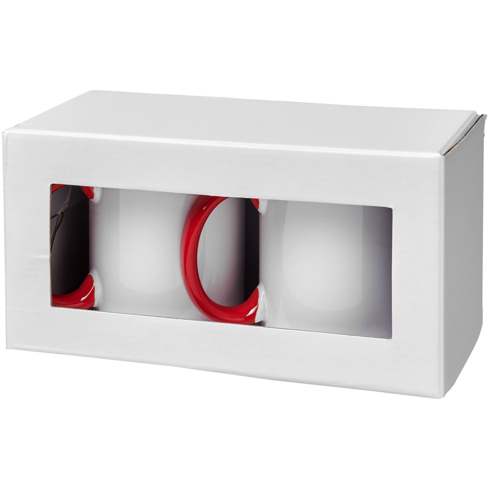 Geschenkset mit zwei keramischen 330-ml-Bechern. Präsentiert in einer weißen Geschenkbox mit durchsichtigem Fenster.