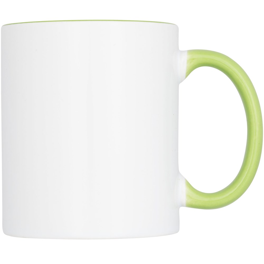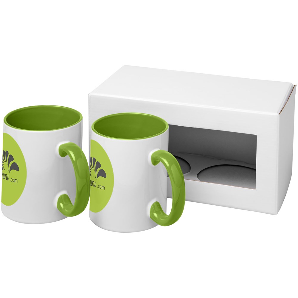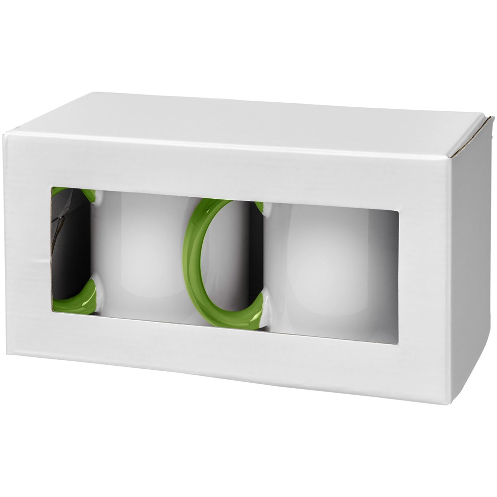 Geschenkset mit zwei keramischen 330-ml-Bechern. Präsentiert in einer weißen Geschenkbox mit durchsichtigem Fenster.