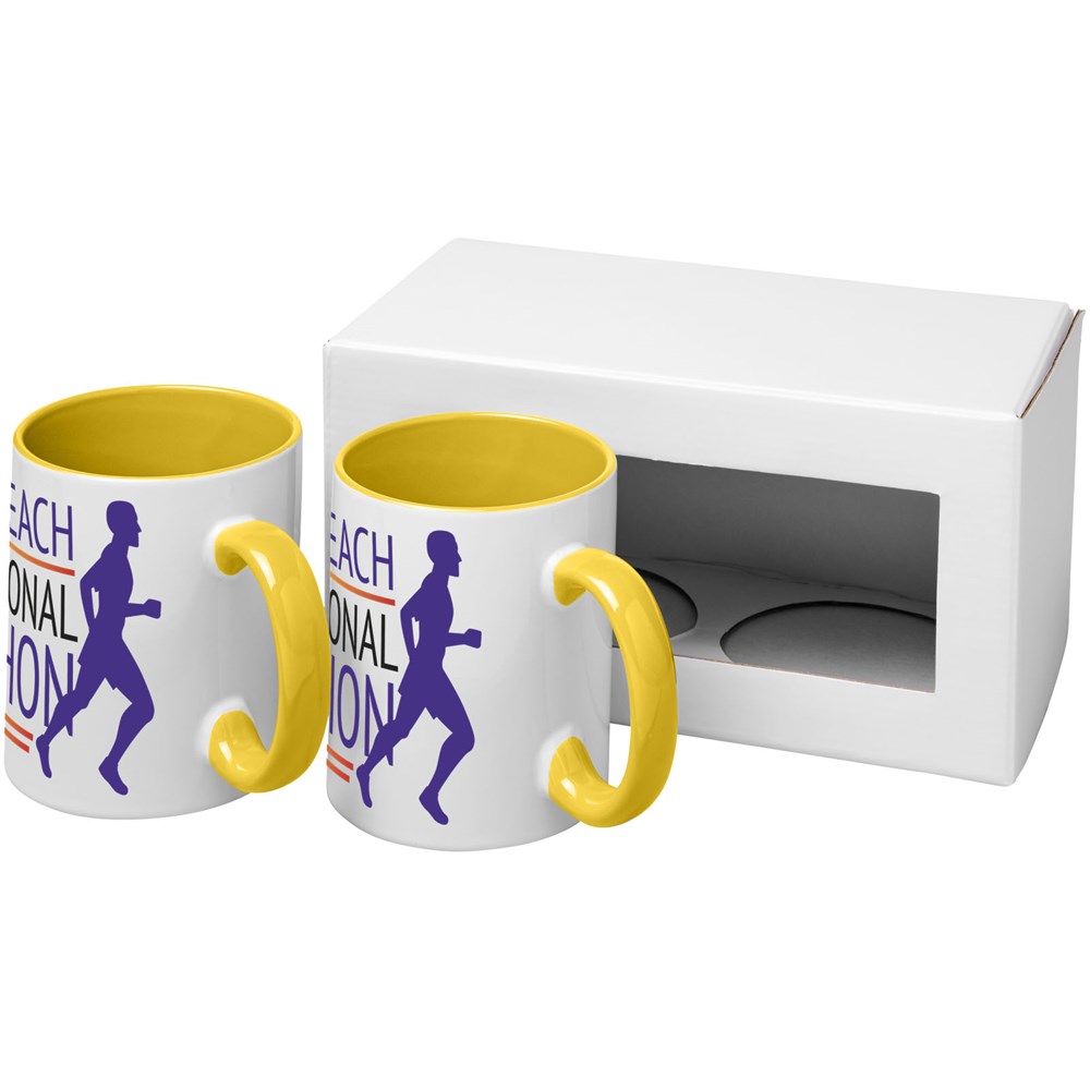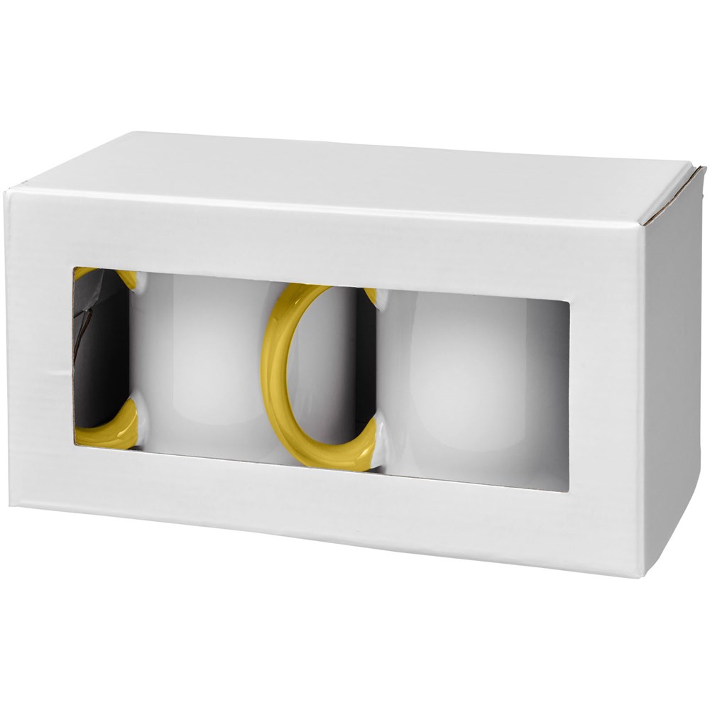 Geschenkset mit zwei keramischen 330-ml-Bechern. Präsentiert in einer weißen Geschenkbox mit durchsichtigem Fenster.