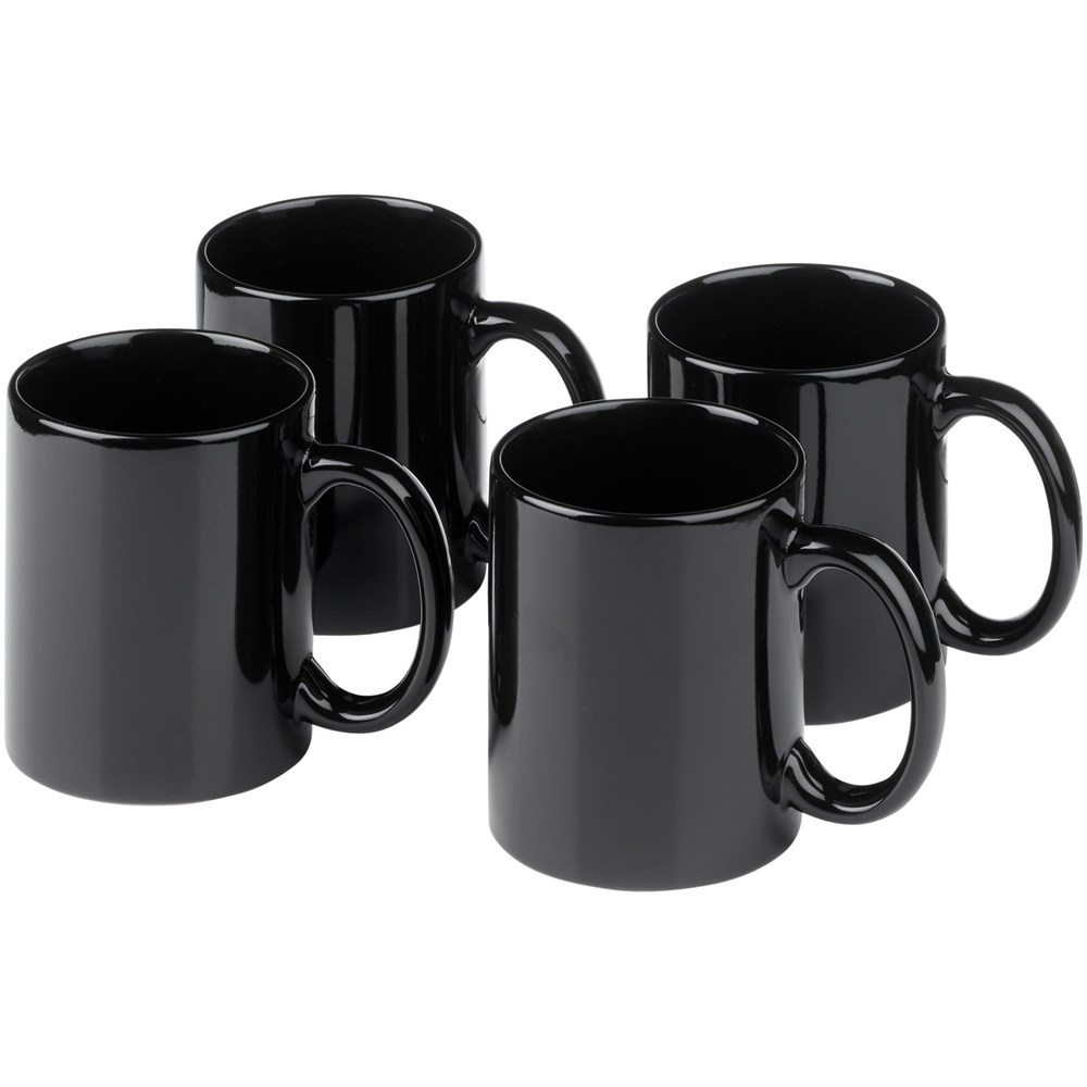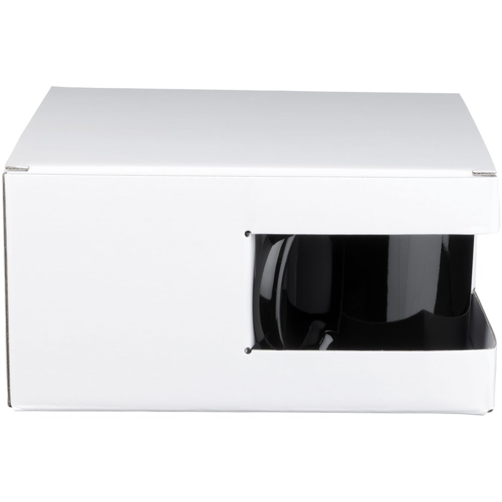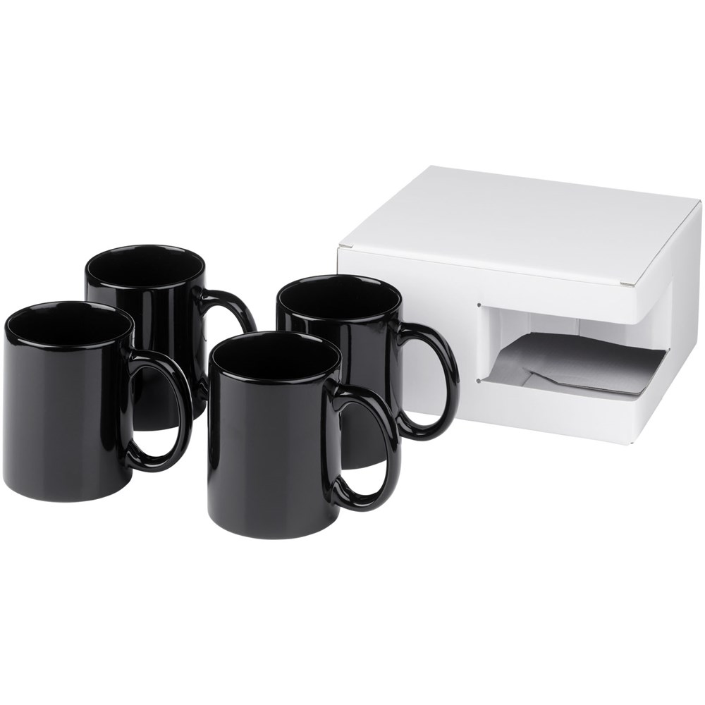 Geschenkset mit vier keramischen 330-ml-Bechern. Präsentiert in einer weißen Geschenkbox mit durchsichtigem Fenster.