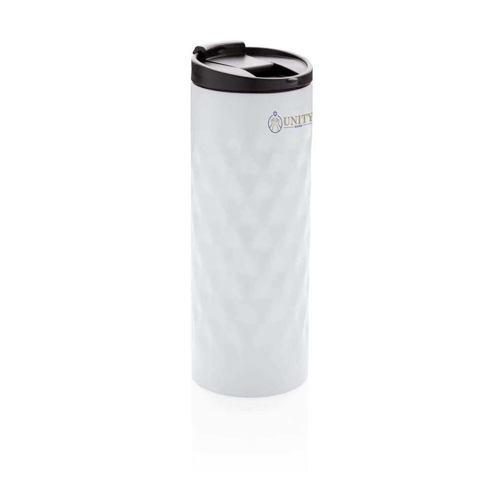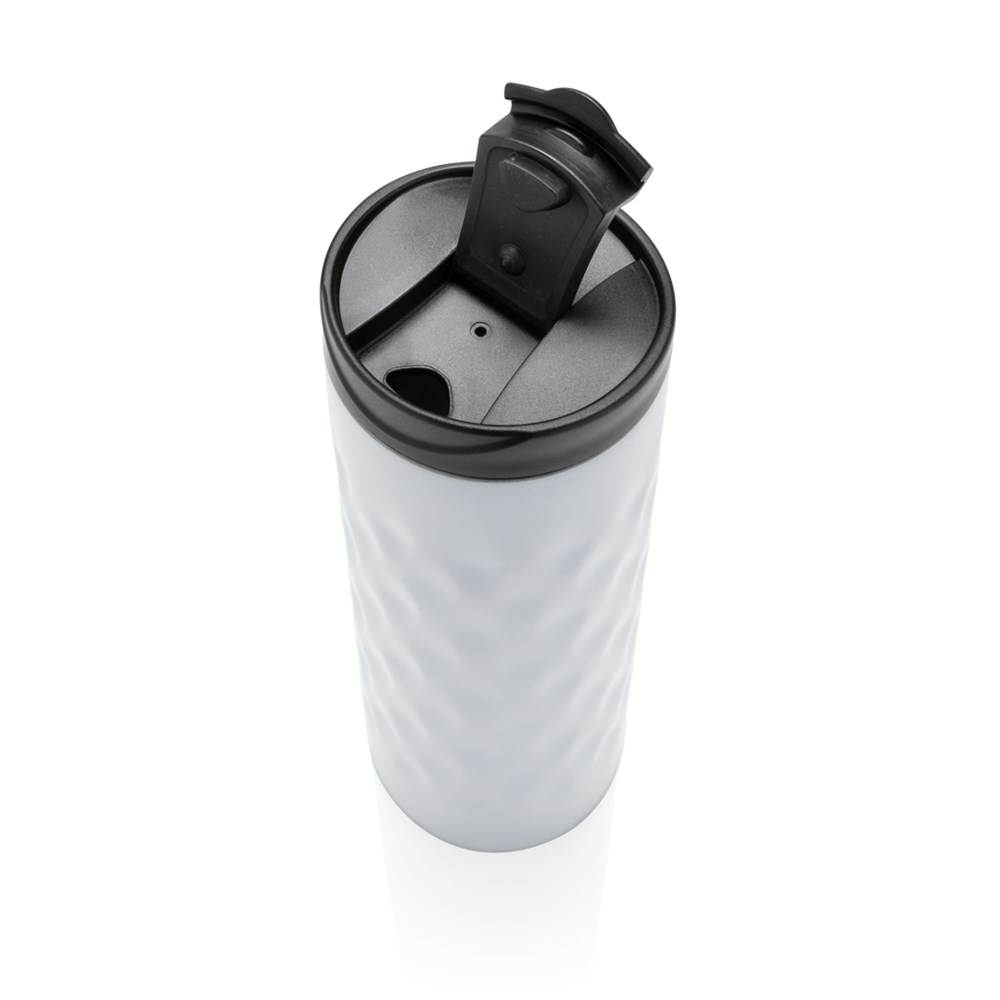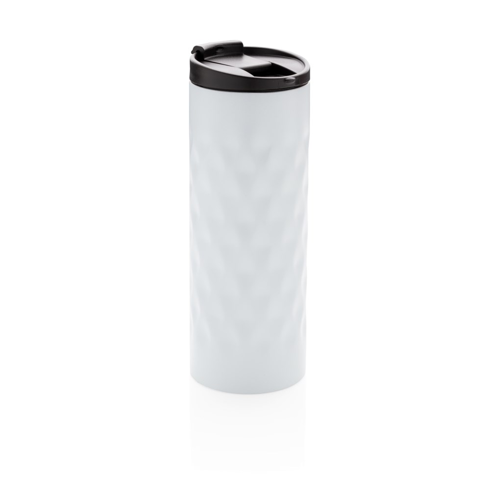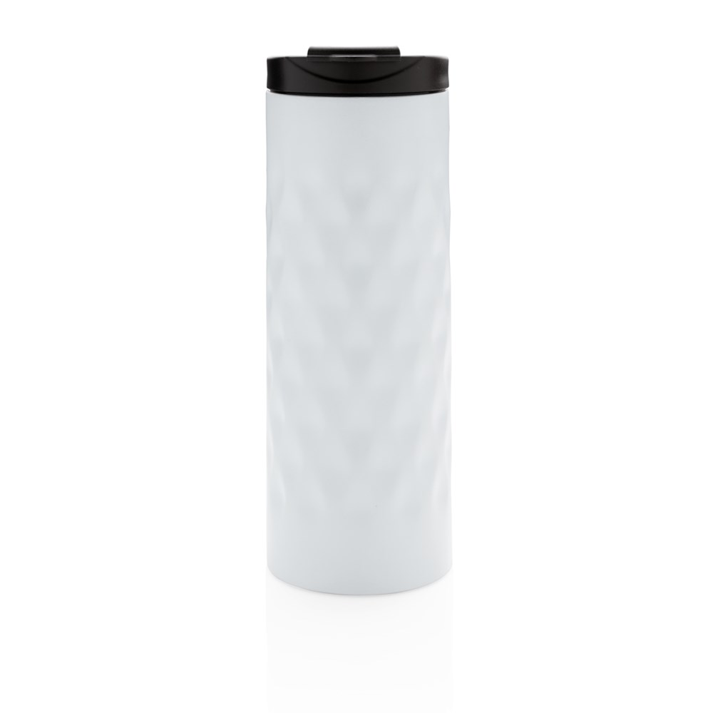 Doppelwandiger Becher aus Edelstahl mit trendigem, geometrischem Cut-Design. Inhalt: 350ml. Nur Handwäsche.