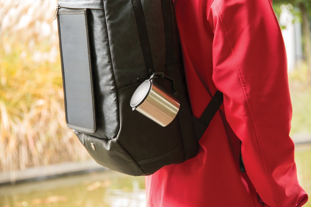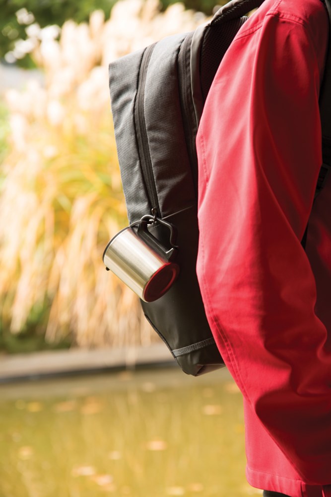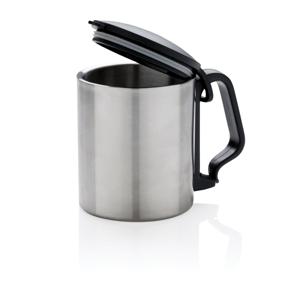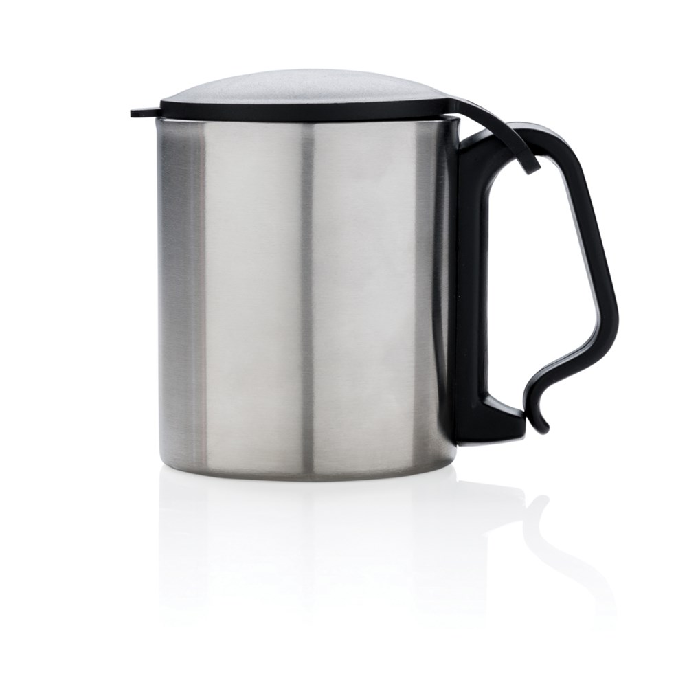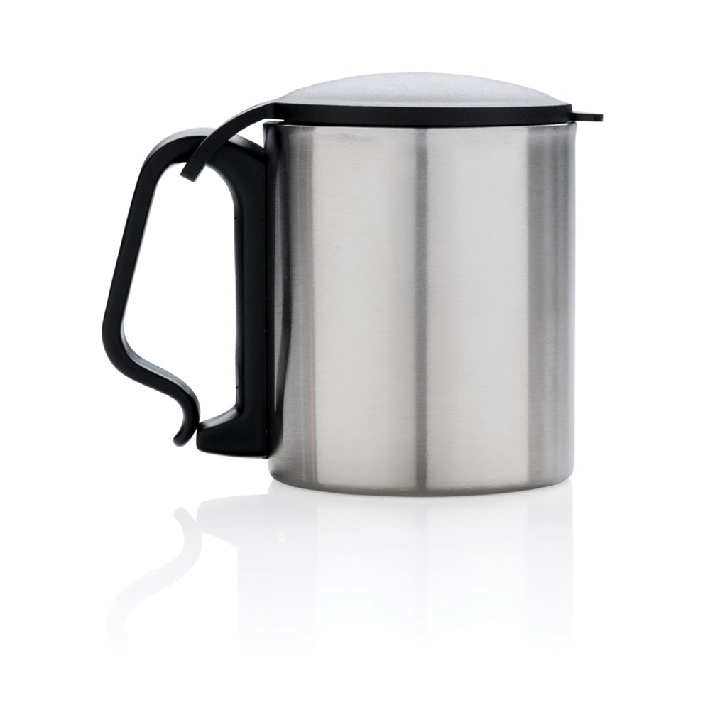 Doppelwandiger Becher aus Edelstahl mit PP Deckel und Griff. 200ml Fassungsvermögen.