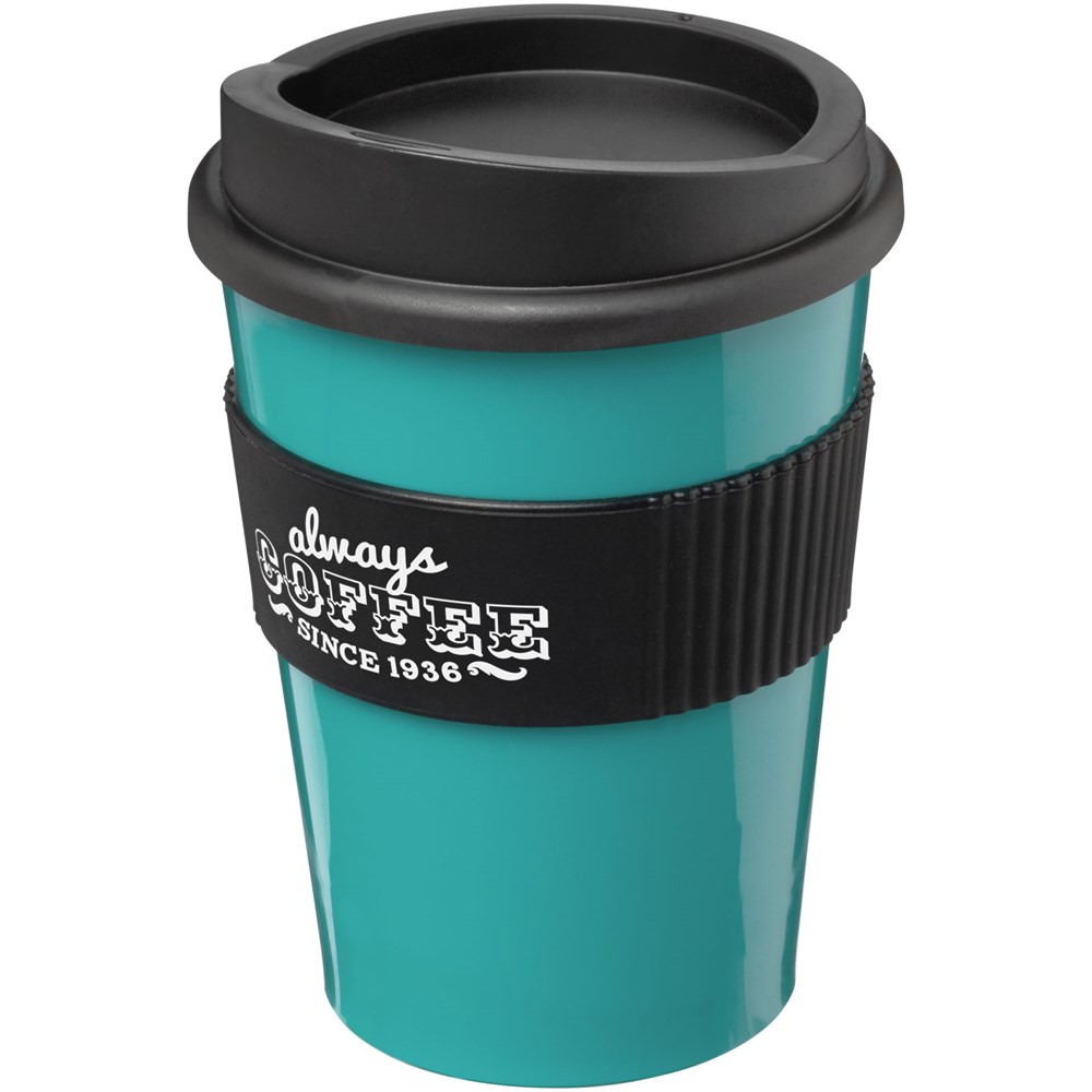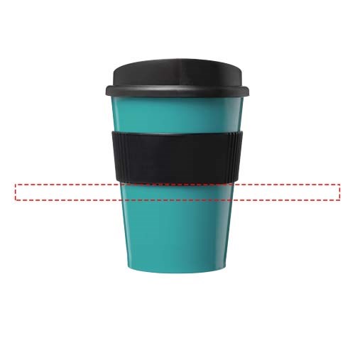 Einwandiger Becher mit Stülpdeckel und Silikon Schutzring. Das Fassungsvermögen beträgt 300 ml.... mehr