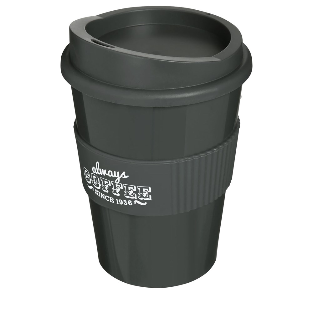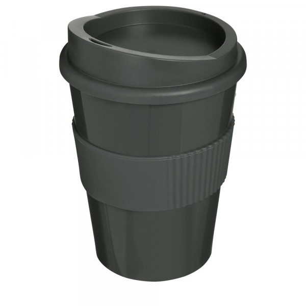 Einwandiger Becher mit Stülpdeckel und Silikon Schutzring. Das Fassungsvermögen beträgt 300 ml.... mehr
