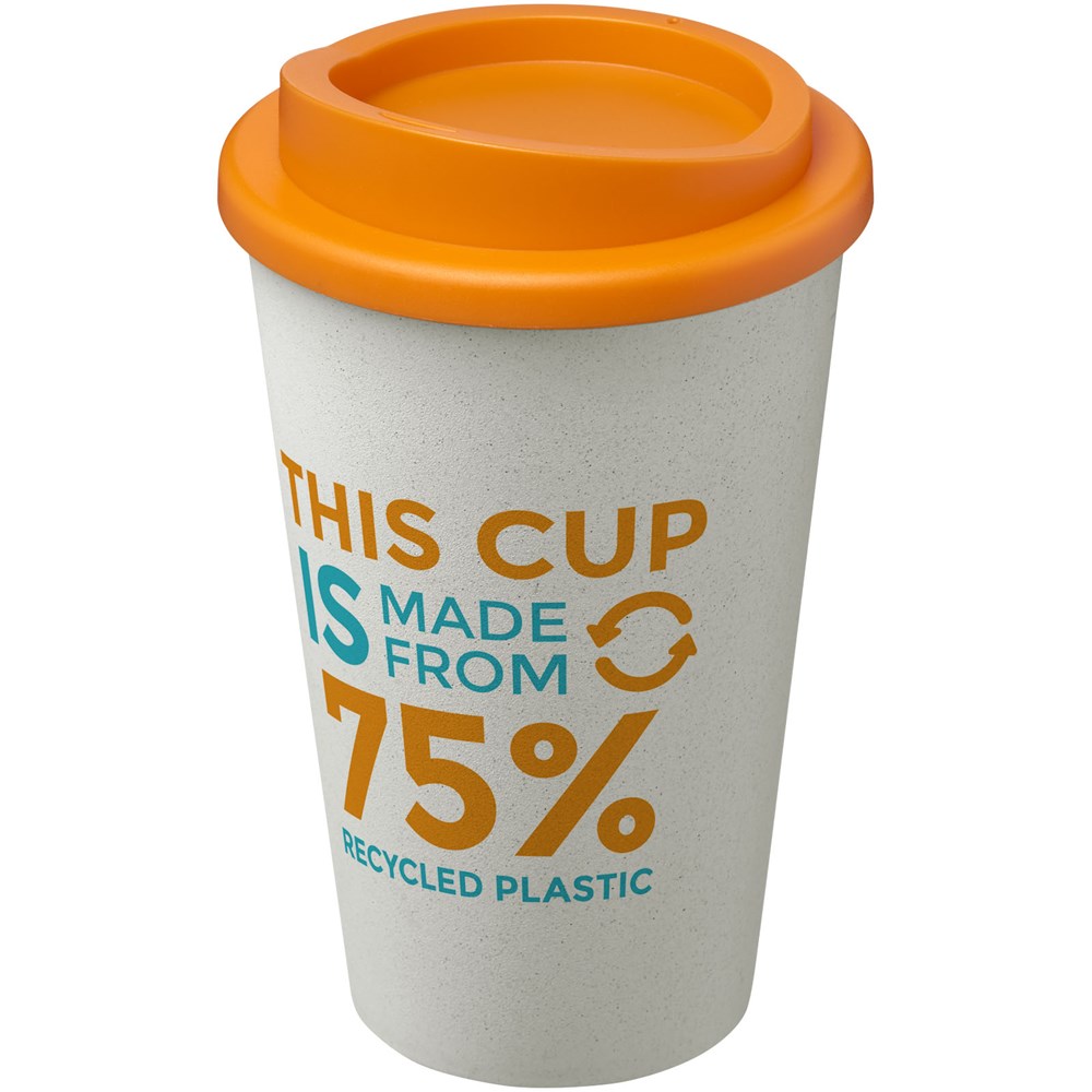 Doppelwandiger Isolierbecher mit Drehverschluss. Der Becher besteht zu 100 % aus recyceltem PP Kunststoff, und der Deckel ist aus lebensmittelechtem PP Kunststoff hergestellt. Da der Deckel nicht aus recyceltem Material besteht, kann er in einer Vielzahl von Farben bestellt werden. Der Schwarzton des Bechers kann aufgrund der Art des recycelten Materials variieren. Das Fassungsvermögen beträgt 350 ml. Hergestellt in Großbritannien. Verpackt in einem zu Hause kompostierbaren Beutel.