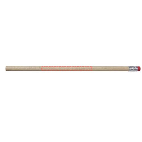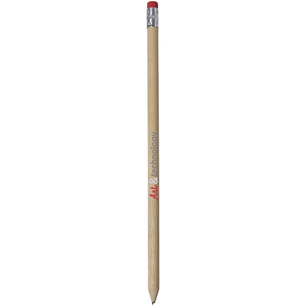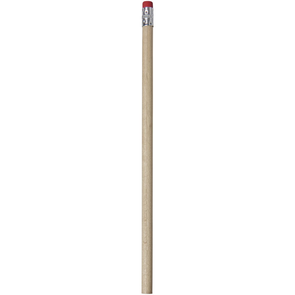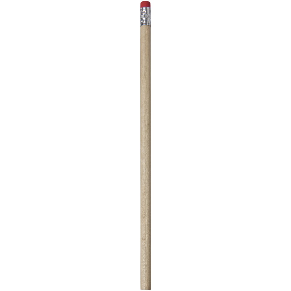 Hölzerner Bleistift mit natürlichem Schaft und farbigem Radiergummi. Nicht angespitzt.