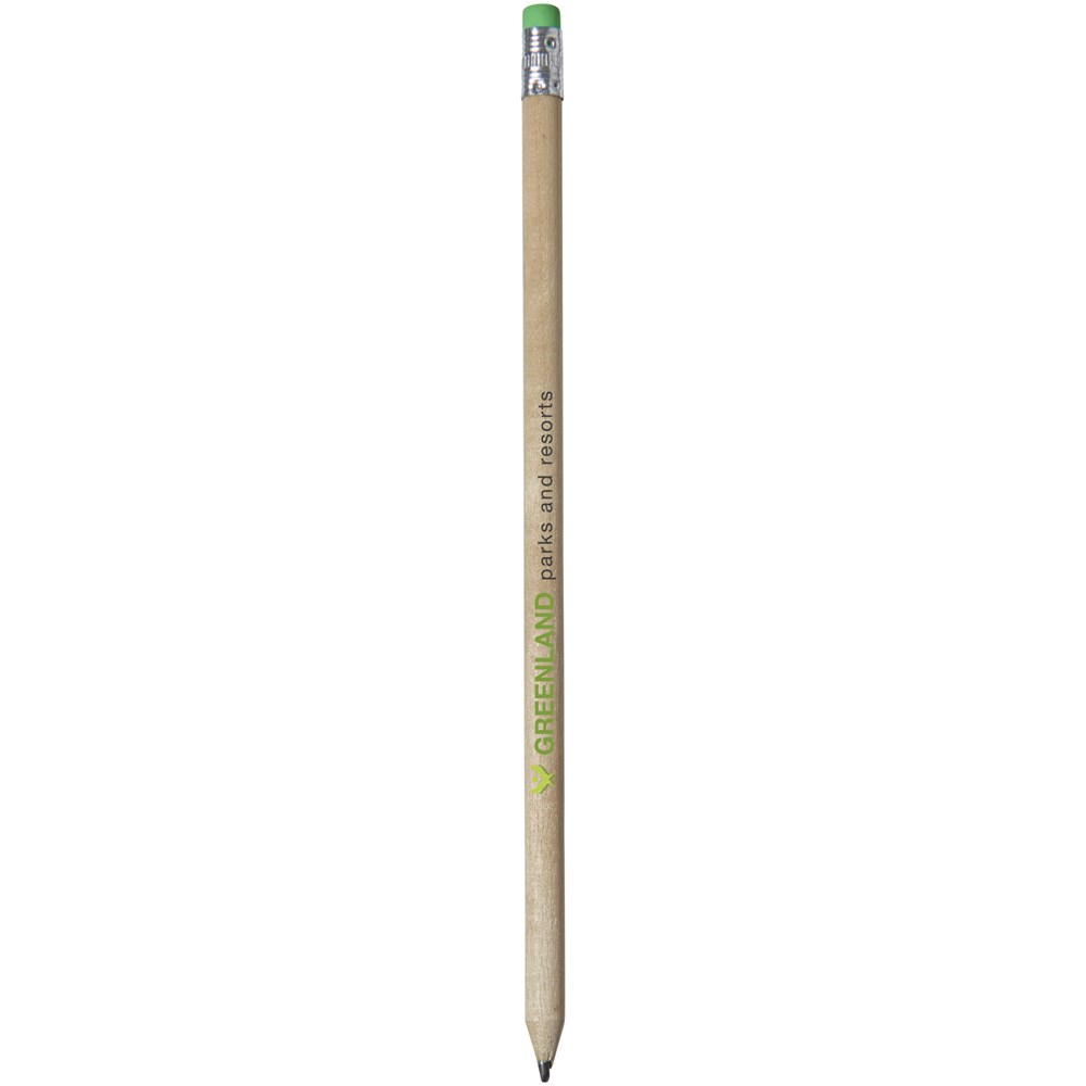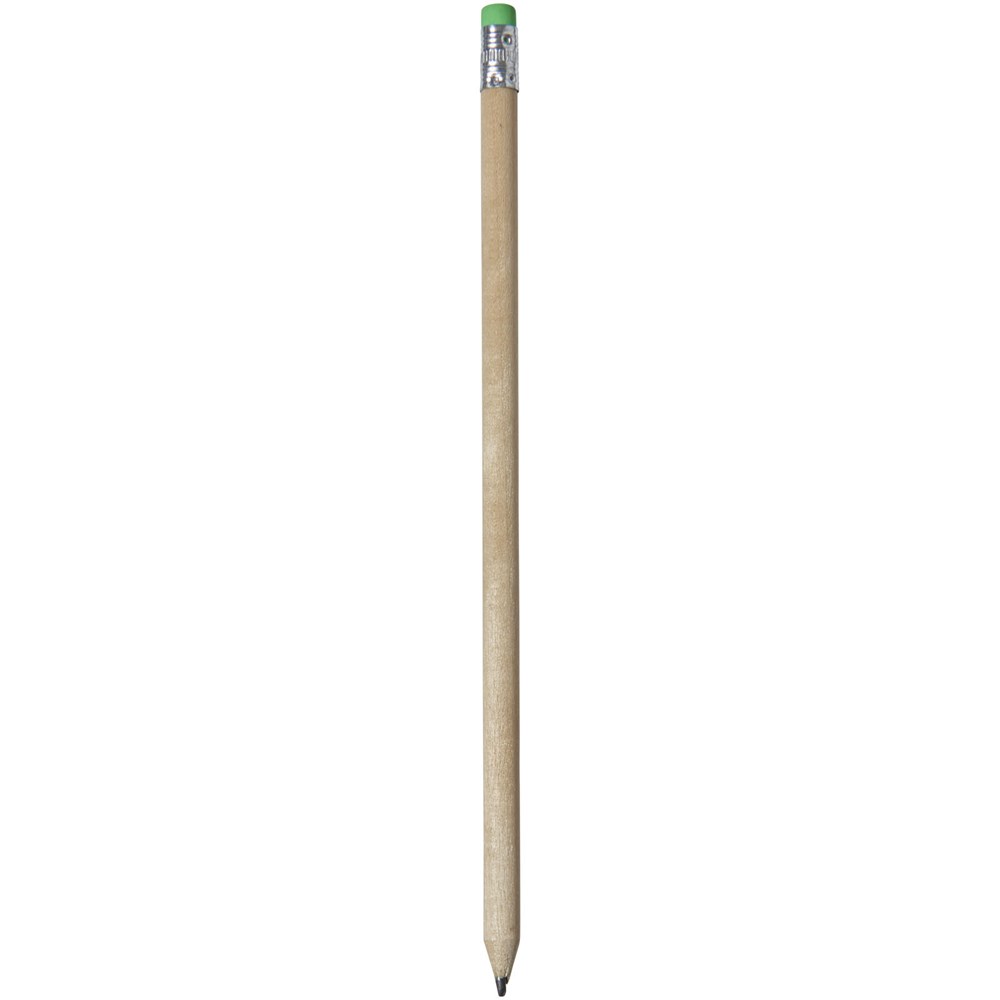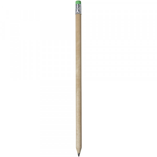 Hölzerner Bleistift mit natürlichem Schaft und farbigem Radiergummi. Nicht angespitzt.