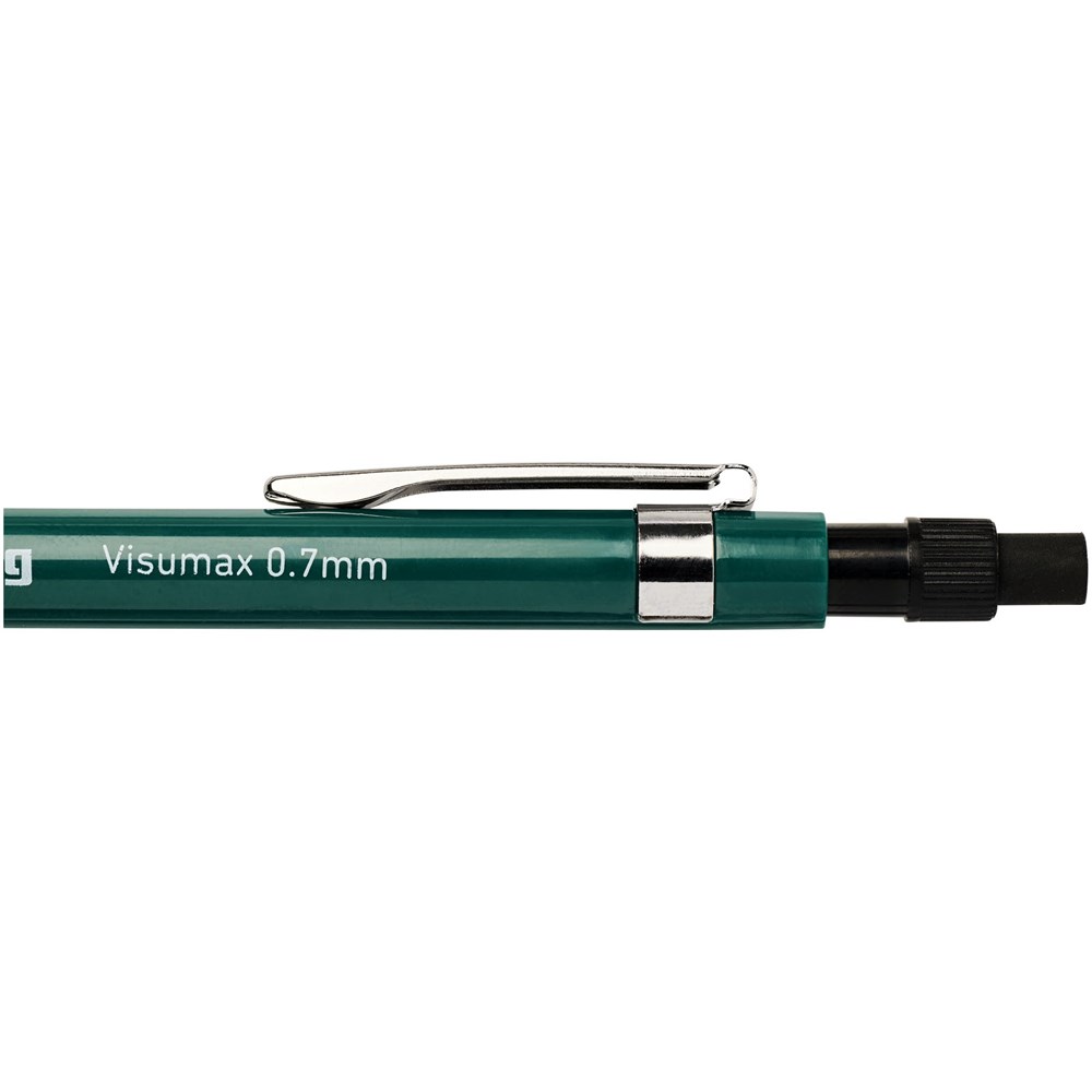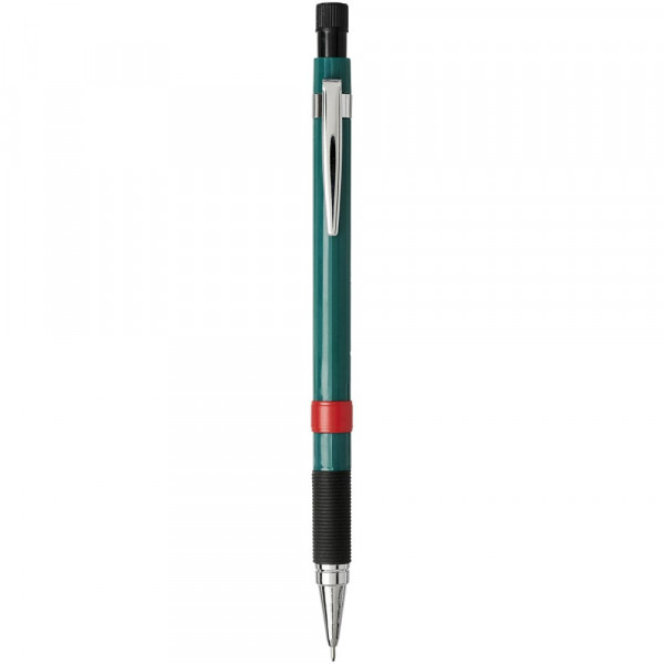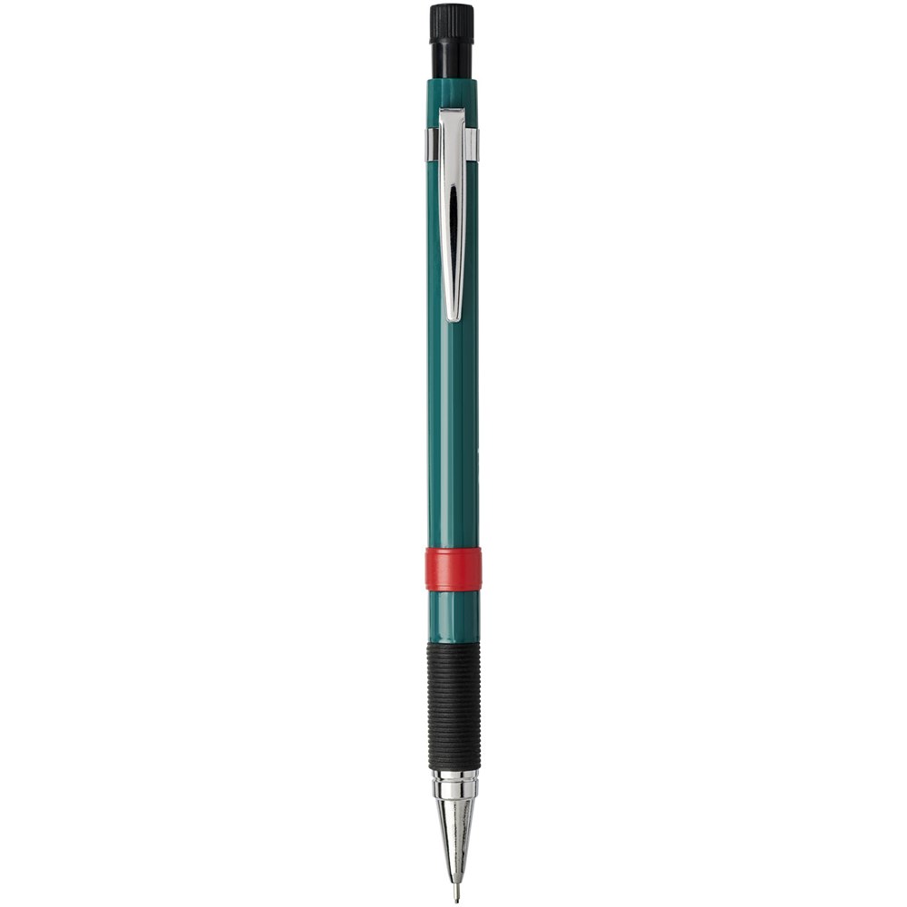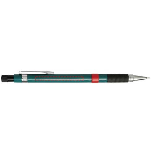 Leichter Druckbleistift mit gummiertem Griff. Ausgestattet mit einem Metallmechanismus mit Mineneinzug und Vollmetall-Nasenkegel. Einzigartiger, verdeckbarer Radiergummi, der mit einer Drehung freigelegt wird. Mit hochpolymeren 2B-Minen. Spitzengröße: 0,7mm.