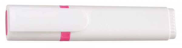 Textmarker mit Kunststoffgehäuse und Kappe mit Clip in weiß. Mundstück mit Zierring und Stopfen in der Schreibfarbe. Standardfarben gelb, grün, magenta. Weitere Farben auf Anfrage.