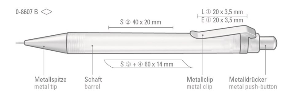 Druckbleistift (0,7mm) mit transparent gefrostetem oder gedecktem Schaft. Metalldrücker, -clip und -spitze verchromt.