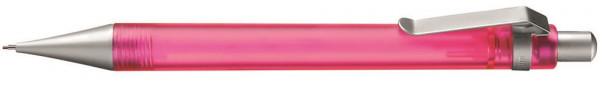 Druckbleistift (0,7mm) mit transparent gefrostetem oder gedecktem Schaft. Metalldrücker, -clip und -spitze verchromt.