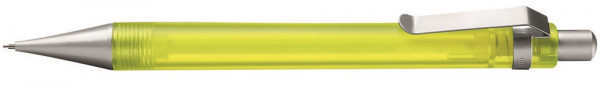 Druckbleistift (0,7mm) mit transparent gefrostetem oder gedecktem Schaft. Metalldrücker, -clip und -spitze verchromt.