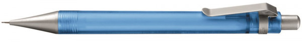 Druckbleistift (0,7mm) mit transparent gefrostetem oder gedecktem Schaft. Metalldrücker, -clip und -spitze verchromt.