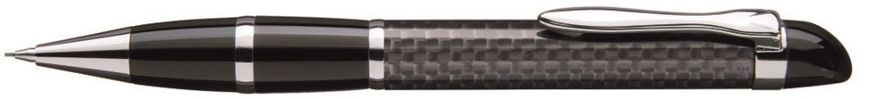 Edler Carbonfaser-Drehbleistift mit flexiblem, glanzverchromtem Metallclip, Metallzierringen, Metallspitze und farbiger Griffzone.