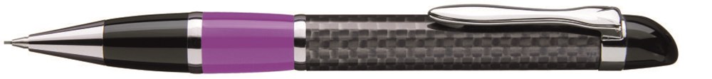 Edler Carbonfaser-Drehbleistift mit flexiblem, glanzverchromtem Metallclip, Metallzierringen, Metallspitze und farbiger Griffzone.