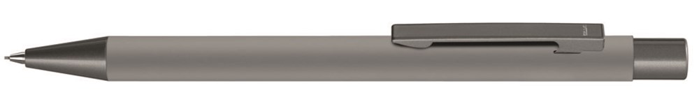Metall-Druckbleistift (0,7mm) mit Softtouch-Schaft, Metallclip, Metallspitze, Clip und Drücker in GUN metallic. Mit Radiergummi im Drücker.