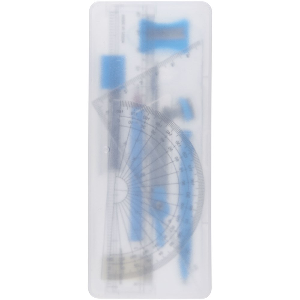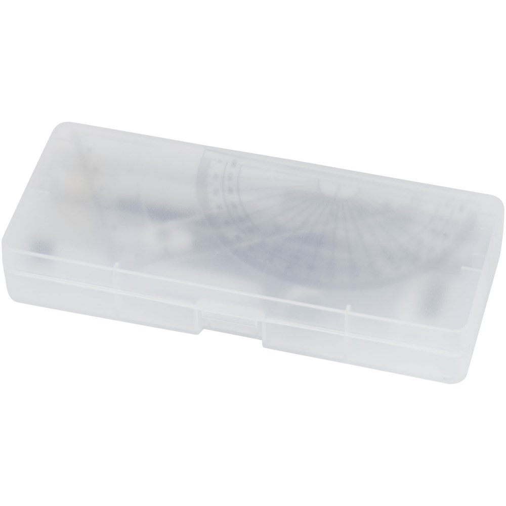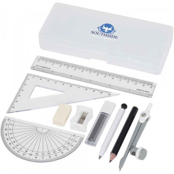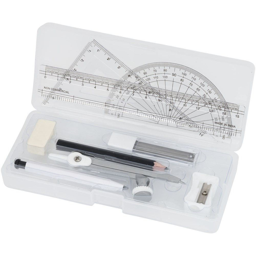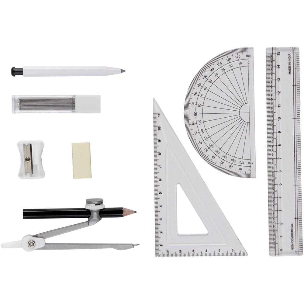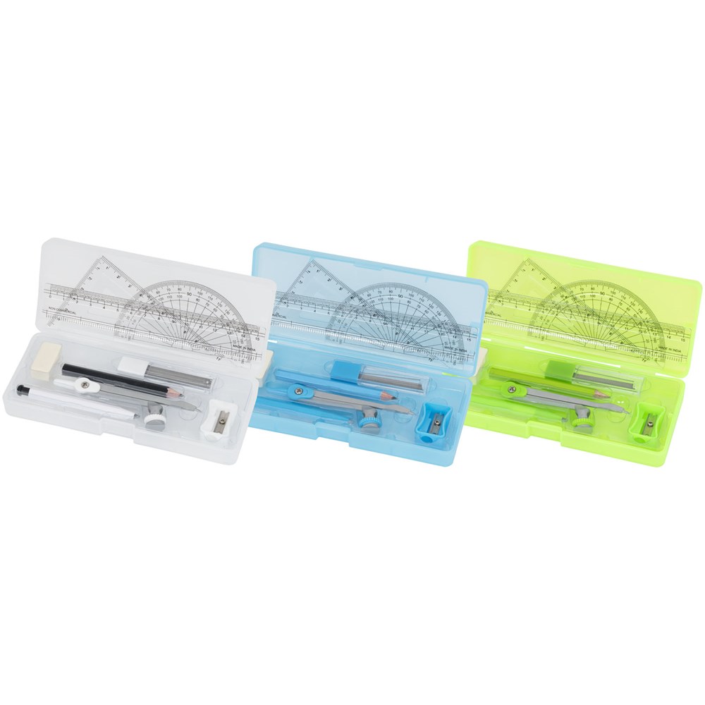 Das 9-teilige Schul-Geometrieset verfügt über einen Kompass, einen Radierer, einen Spitzer, einen Bleistift, einen Druckbleistift, 10 Minen (0,5), ein Lineal, ein Zeichendreieck und eine Winkelmesser.