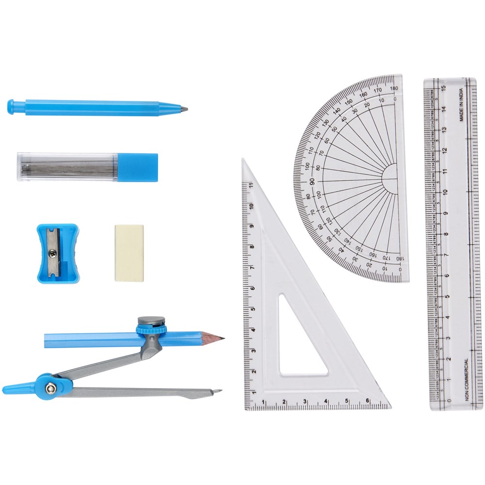 Das 9-teilige Schul-Geometrieset verfügt über einen Kompass, einen Radierer, einen Spitzer, einen Bleistift, einen Druckbleistift, 10 Minen (0,5), ein Lineal, ein Zeichendreieck und eine Winkelmesser.