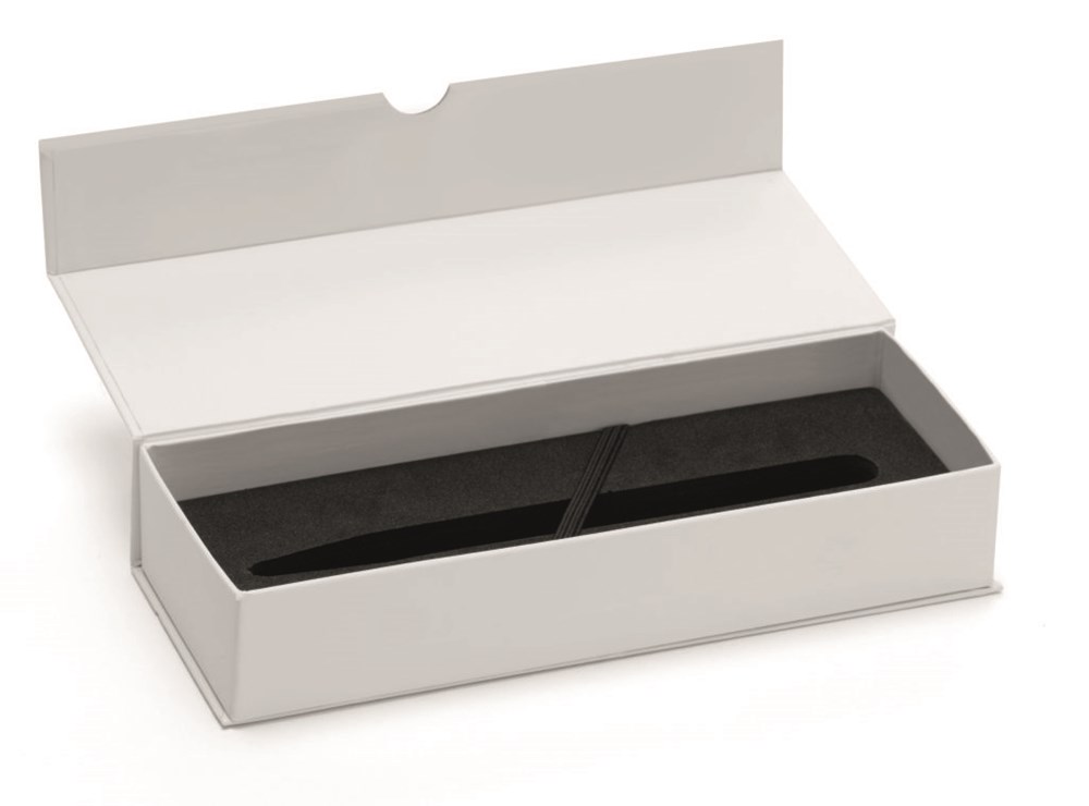 Klappetui in uni weiß oder schwarz mit Magnetverschluss für ein oder zwei Schreibgeräte. Kartonschuber in weiß. Auf Anfrage ist der Kartonschuber mit 4c-Gestaltung erhältlich.
