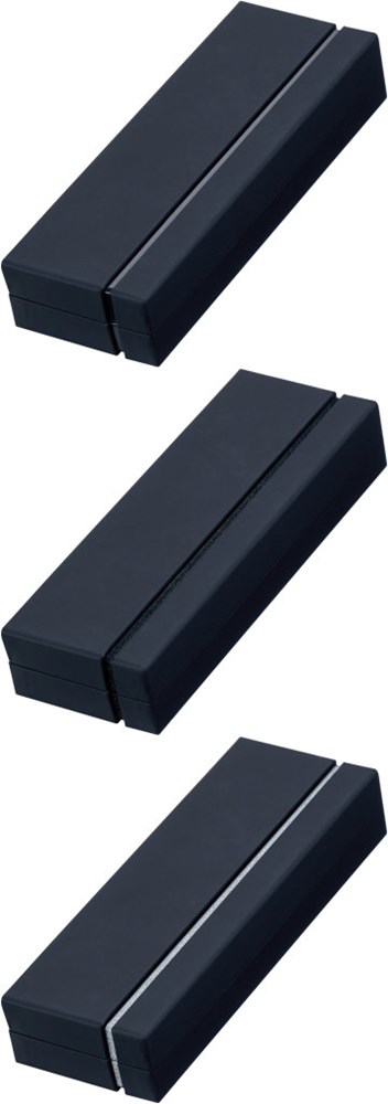 Zweiteiliges, schweres Pappetui in schwarz mit abnehmbarem Deckel mit eingelassener Ziernaht in schwarz glänzend oder schwarz, bzw. silber glitzernd, Kisseneinlage für ein oder zwei Schreibgeräte.