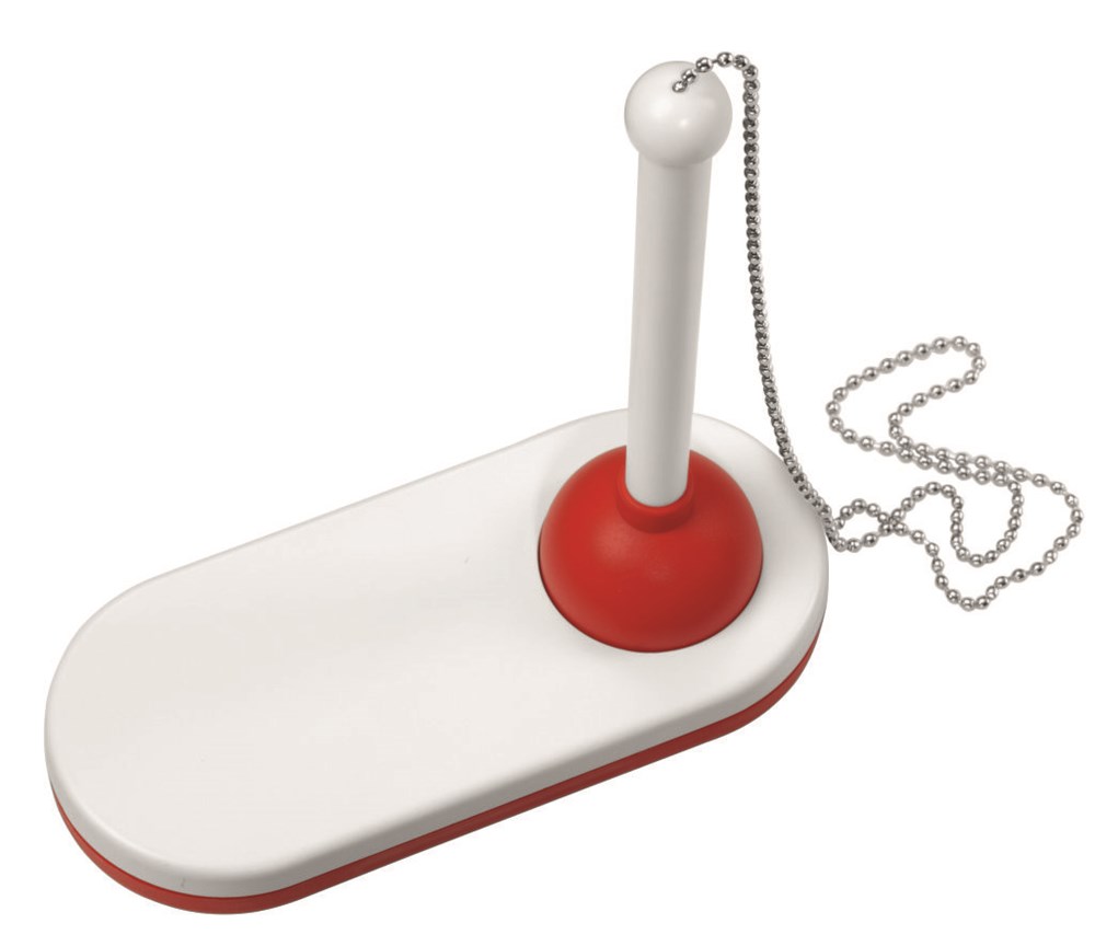 Kugelschreiberständer mit Kugelschreiber an einer Metallkette. Große Werbeplatte.