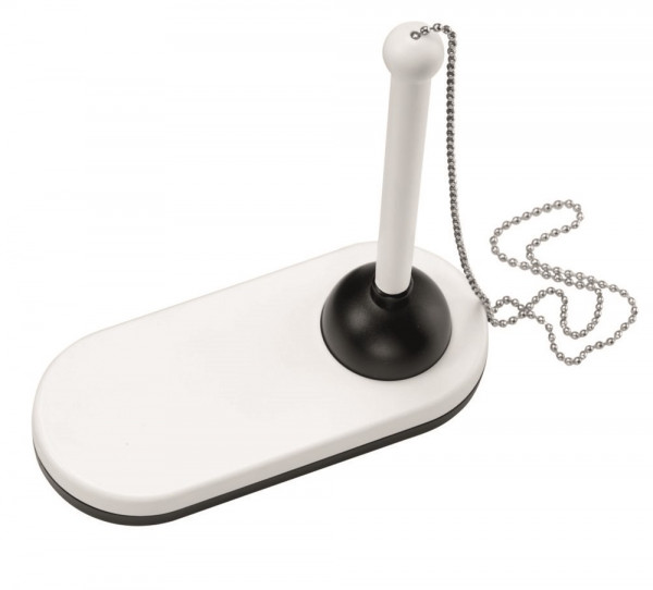 Kugelschreiberständer mit Kugelschreiber an einer Metallkette. Große Werbeplatte.