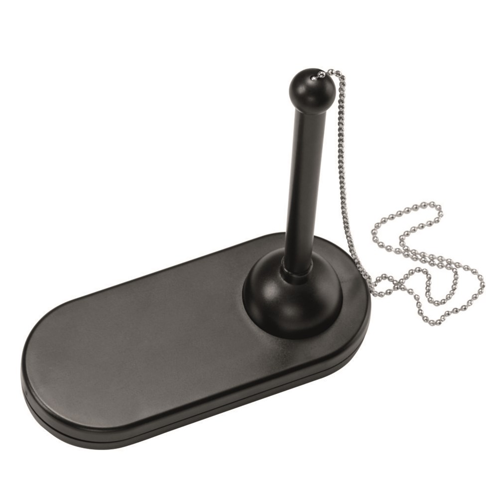 Kugelschreiberständer mit Kugelschreiber an einer Metallkette. Große Werbeplatte.
