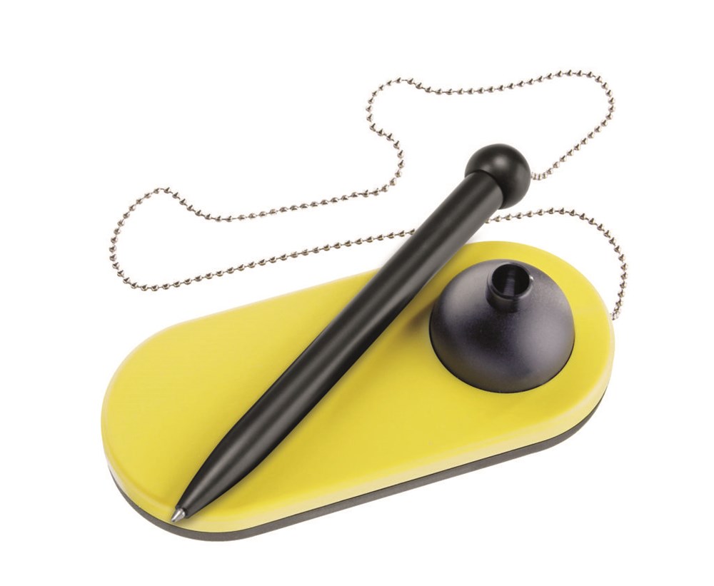 Kugelschreiberständer mit Kugelschreiber an einer Metallkette. Große Werbeplatte.