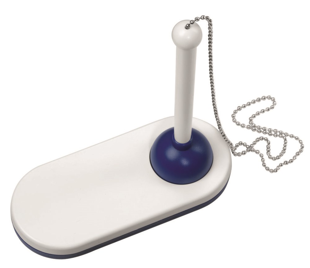 Kugelschreiberständer mit Kugelschreiber an einer Metallkette. Große Werbeplatte.