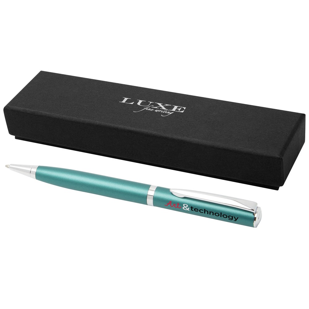 Leichter Kugelschreiber in exklusivem Design. Erhältlich in drei Sonderfarben, die sich auf die verschiedenen Tageszeiten beziehen: „Sunset Orange“ für den Morgen, „Dusk Blue“ für den Abend und „Green Ray“ für die Zeit dazwischen. Inkl. blauer Ersatzmine, verpackt in einer „LUXE“ Geschenkbox.