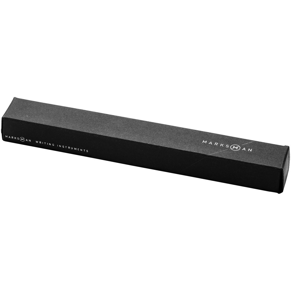 Die Beibehaltung der weichen Linie des Stifts durch eine durchdachte Gestaltung des Clips, der aus dem Hauptschaft hervorgeht, zeigt eine neue Art und Weise, Dinge zu tun. Kugelschreiber im exklusiven Marksman Design mit Drehmechanismus, Mine aus Schweizer Fertigung, Marksman Stiftetui (Größe: 15 x 2 x 1,5 cm).