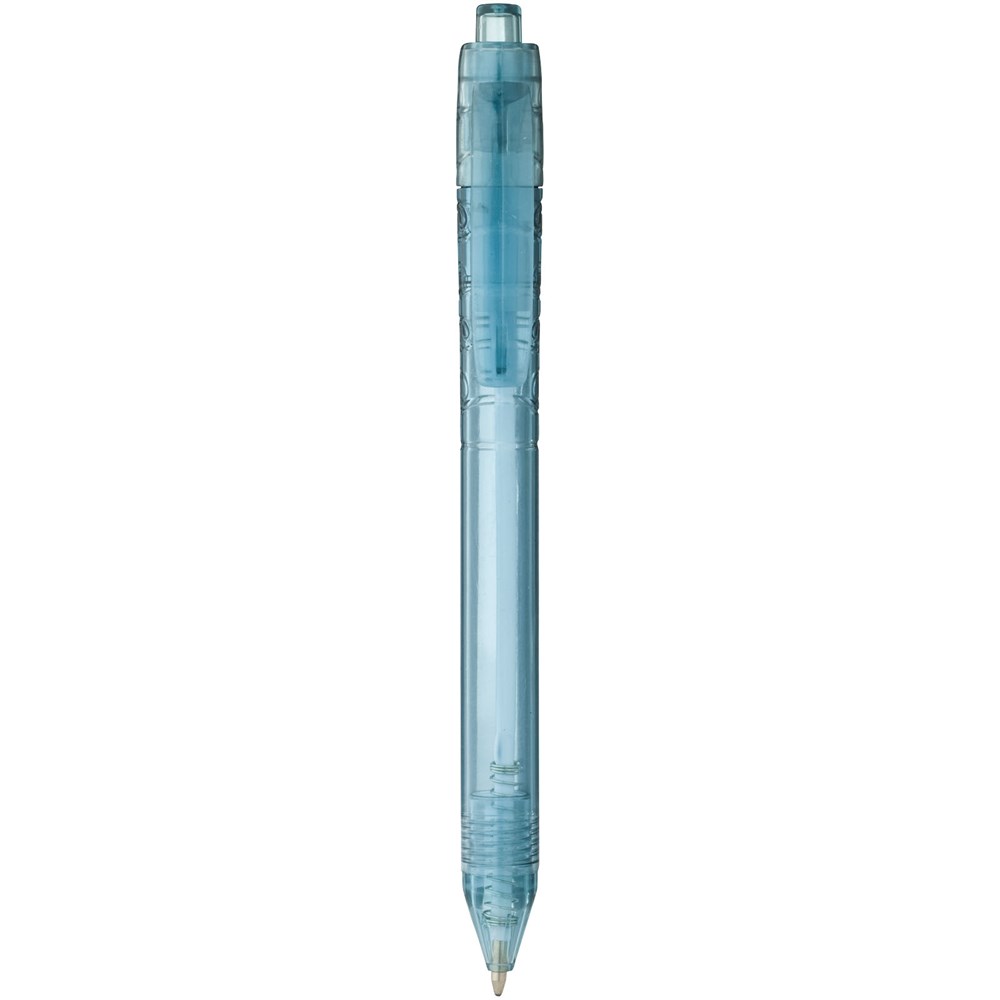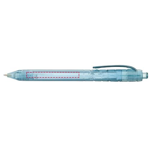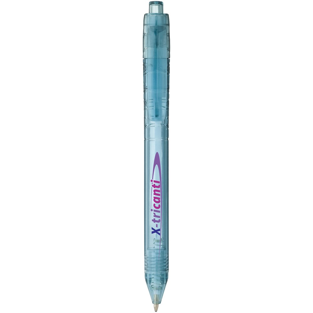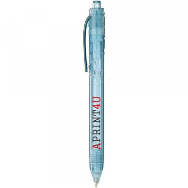 Kugelschreiber mit Klickmechanismus und transparentem Schaft. Der Schaft besteht aus recycelten Wasserflaschen, was dazu beiträgt, die Menge an Kunststoffabfällen zu reduzieren.