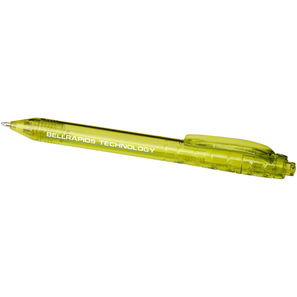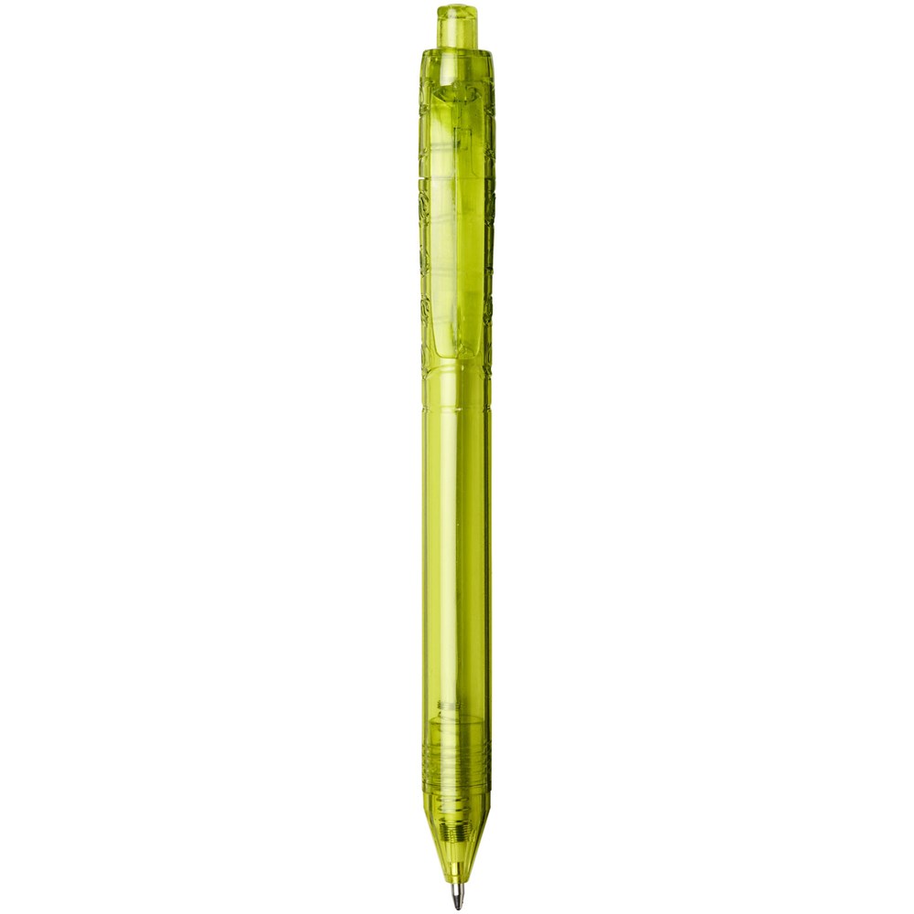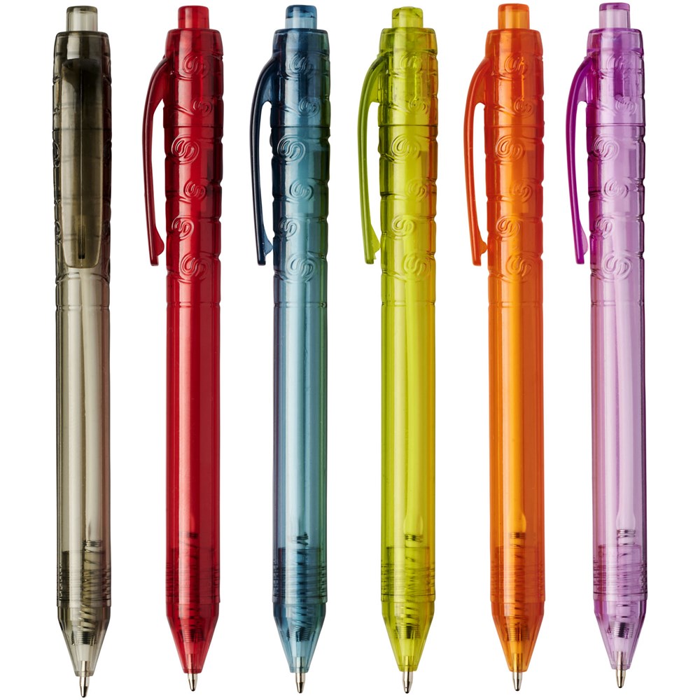 Kugelschreiber mit Klickmechanismus und transparentem Schaft. Der Schaft besteht aus recycelten Wasserflaschen, was dazu beiträgt, die Menge an Kunststoffabfällen zu reduzieren.