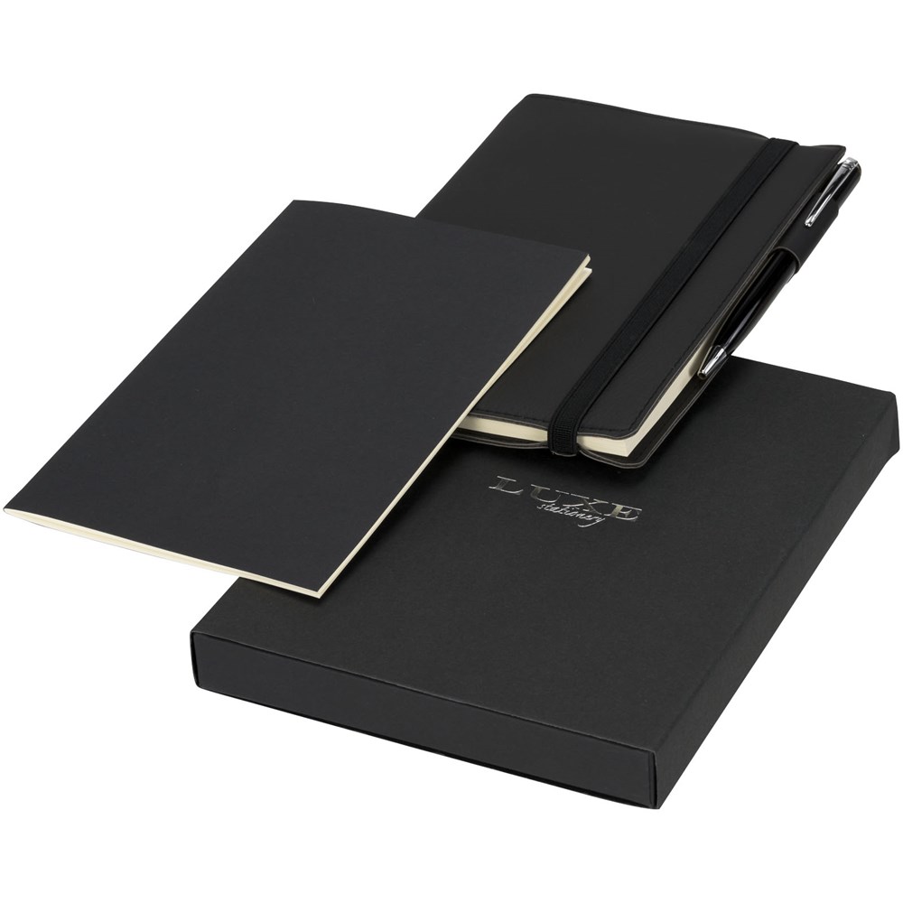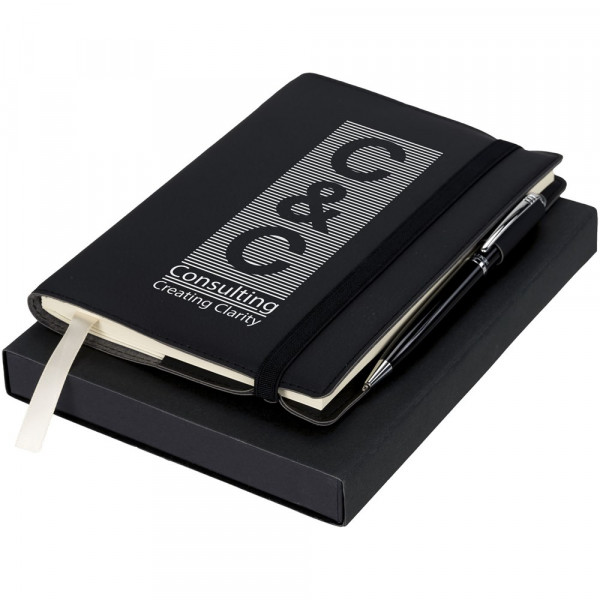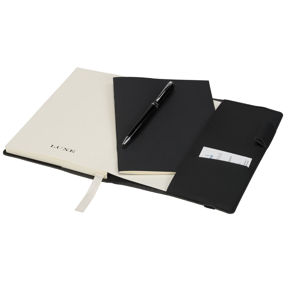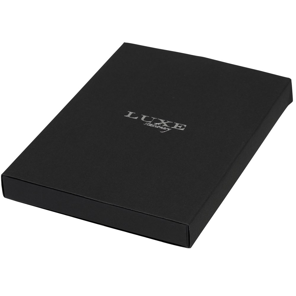 A5 Notizbuch mit einem biegsamen Einband, in exklusivem Design (80 Blatt/80 g/m2 liniertes cremefarbenes Papier), mit integrierter Stiftschlaufe und Visitenkarteneinsatz an der Innenseite der Rückseite. Inklusive einem extra Heftchen, um separate Notizen zu machen. Inklusive einem Kugelschreiber und zusammen verpackt in einer „LUXE“-Geschenkschachtel.