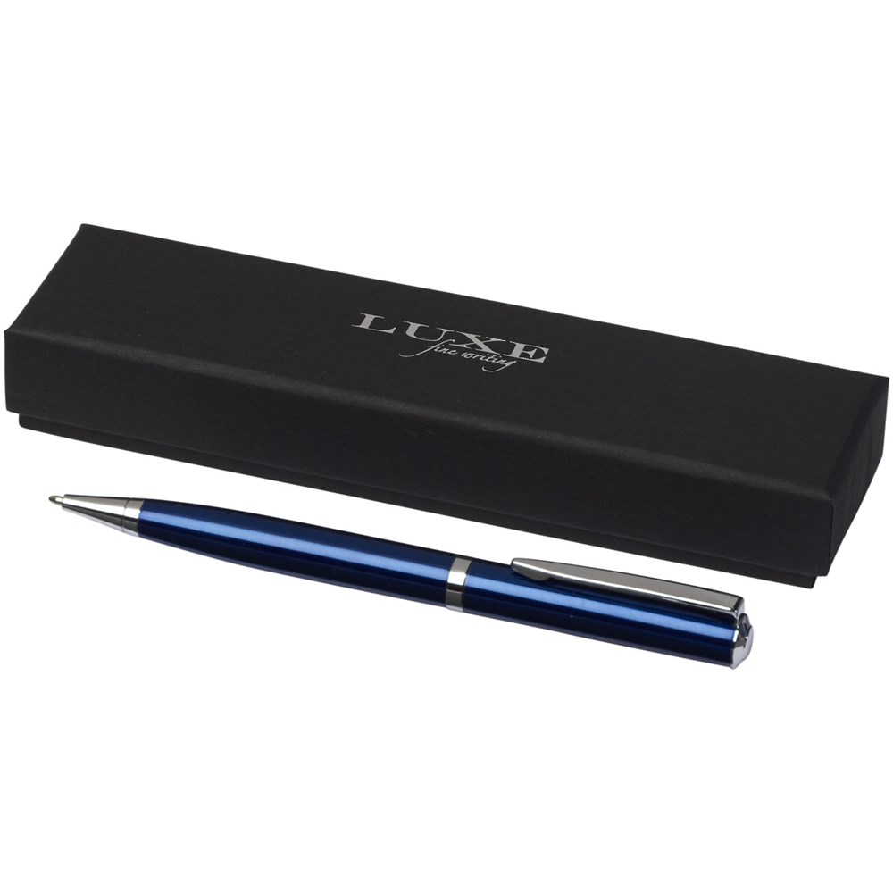 Der lackierte Kugelschreiber kommt mit einem exklusiven Design und mit silberfarbenen Details. Inklusive einer hochwertigen schwarzen Ersatzmine und verpackt in einer „LUXE“-Geschenkschachtel (16 x 4,5 x 2,8 cm).