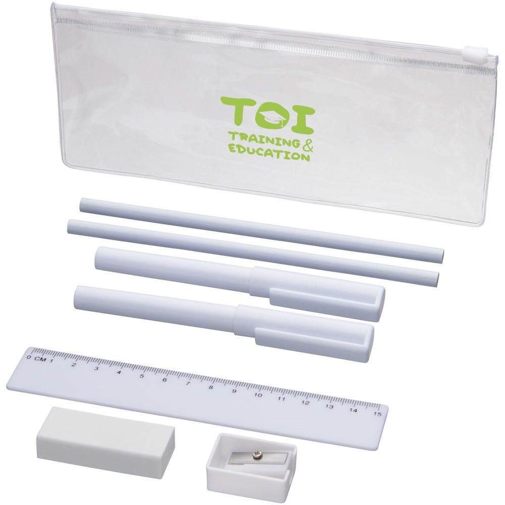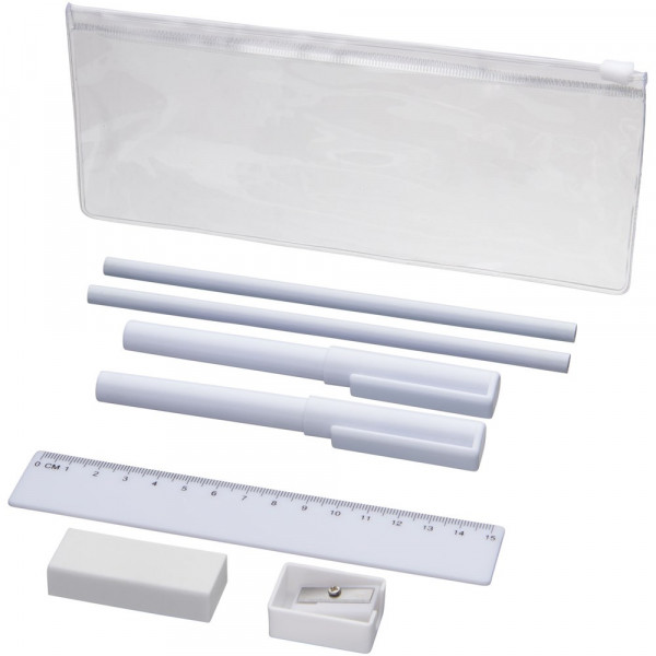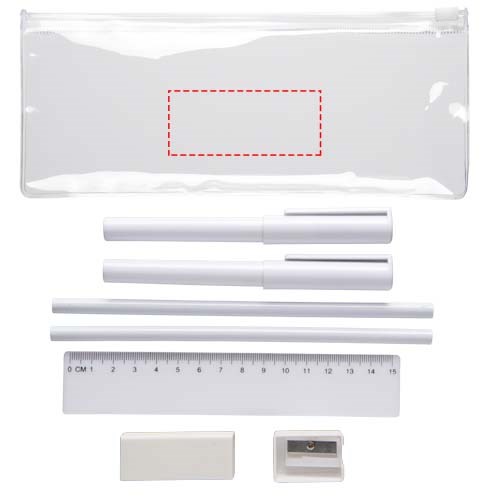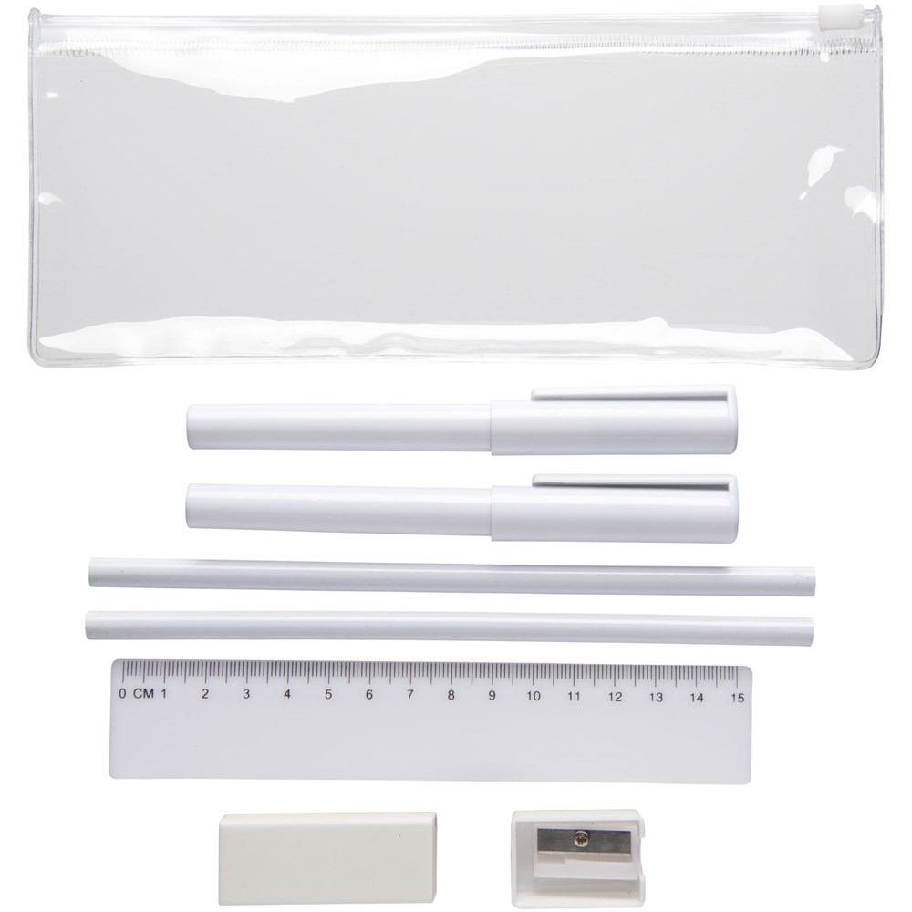 PVC-Federmäppchen mit 2 Kugelschreibern (einer mit schwarzer Tinte, der andere mit blauer), 2 Bleistiften, einem Lineal, einem Anspitzer und einem Radiergummi.