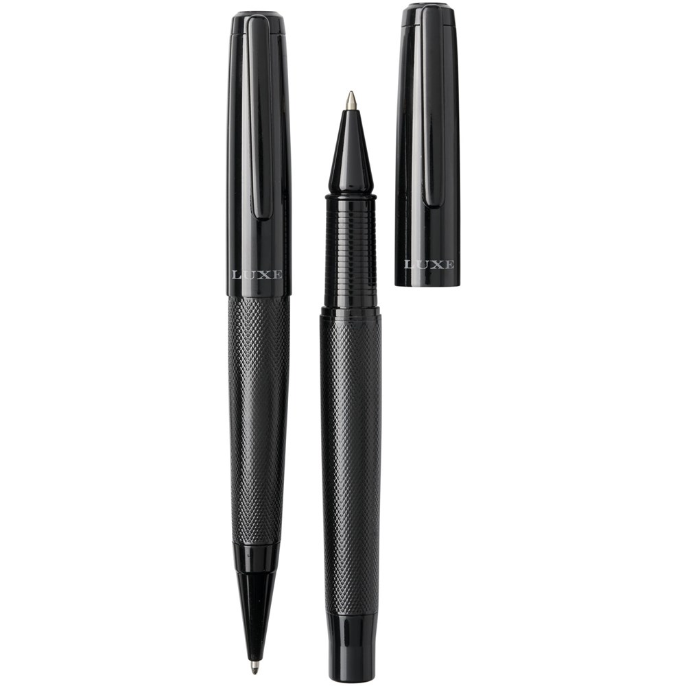 Kugelschreiber- und Tintenroller-Geschenkset mit einem schwarzen oberen und unteren Schaft in glänzender Ausführung, geliefert in einer Luxe-Geschenkbox. Kugelschreiber: 14 x 1,45 cm, Gewicht: 40 g, Schreiblänge: 800 m. Durchmesser des Tintenrollers: 13,8 x 1,45 cm, Gewicht: 54 g, Schreiblänge: 400 m.