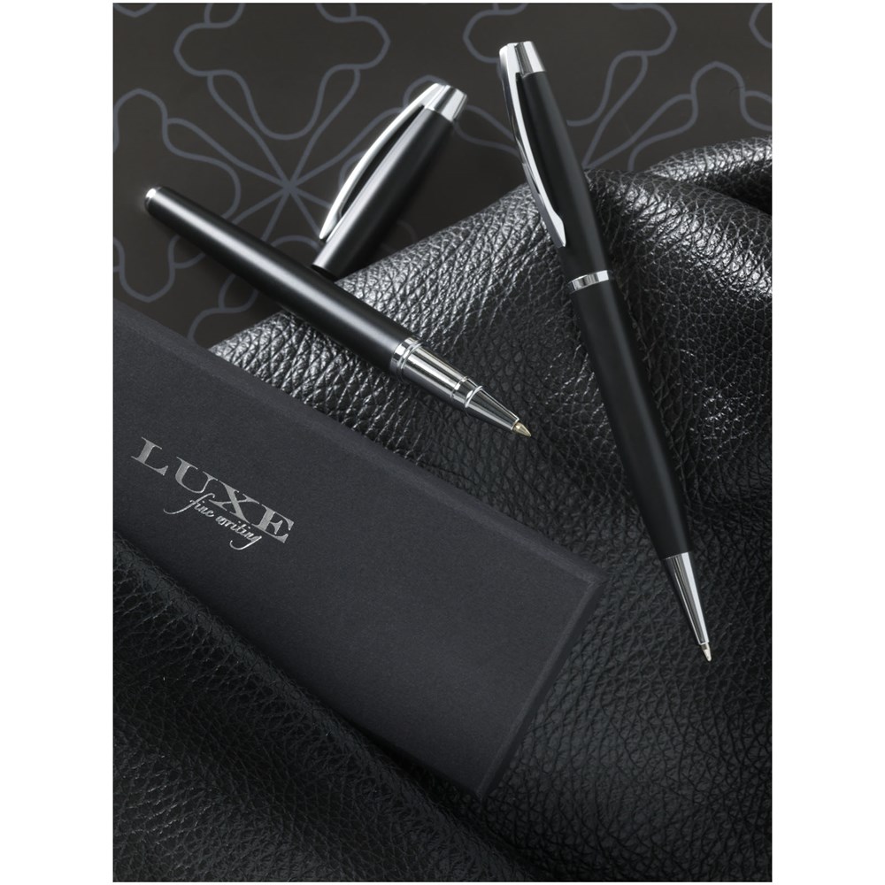Duo Stifte-Geschenkset mit einem Kugelschreiber mit Dreh-Mechanismus und einem Tintenroller mit Kappe. Inklusive Premium-Schwarz zum Nachfüllen. Verpackt in einer Geschenkbox von LUXE.