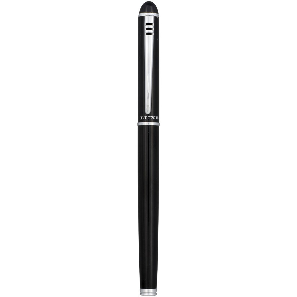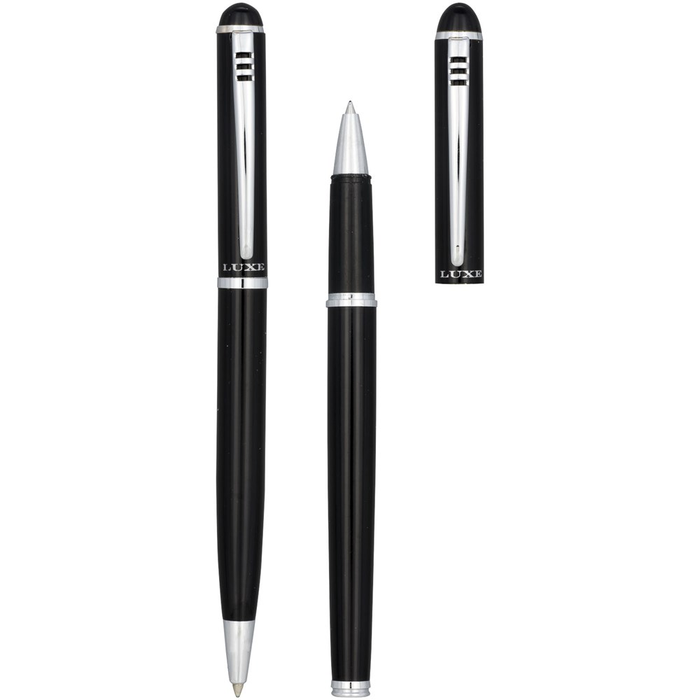 Exklusiv gestaltetes Schreibset aus Kugelschreiber zum Drehen und Tintenroller mit Kappe. Erhältlich in glänzendem Schwarz, mattem Silber und mattem Blau. Verpackt in einer Geschenkbox von LUXE.