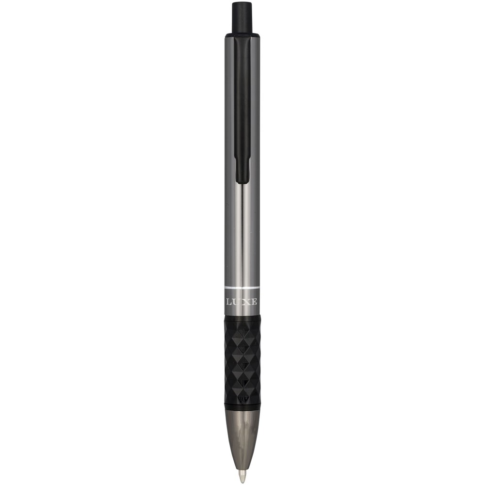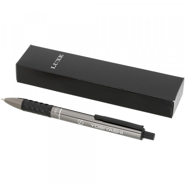 Schlankes Erscheinungsbild und solide Haptik kommen in diesem Klick-Kugelschreiber im exklusiven Design zusammen. Der Schaft wird durch einen taktilen Griff ergänzt. Mit schwarzer Premium-Mine und in einem „LUXE“-Geschenkkarton verpackt (17 x 3,5 x 2 cm).
