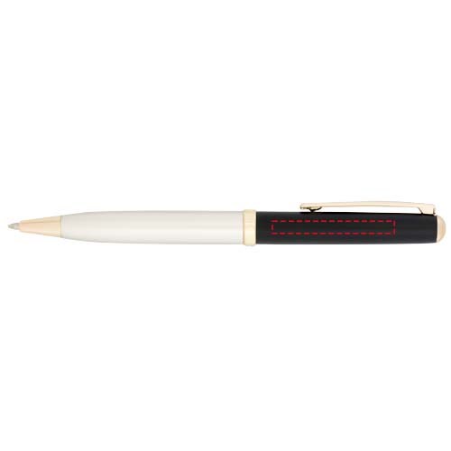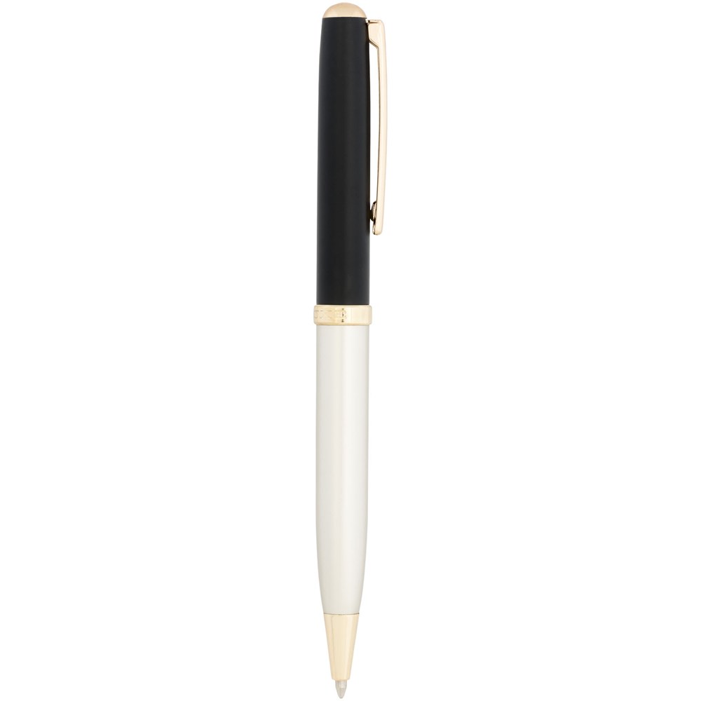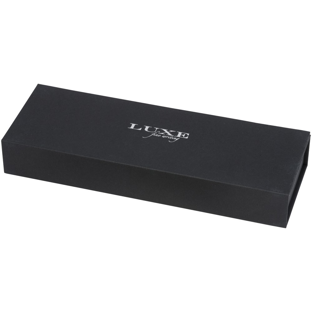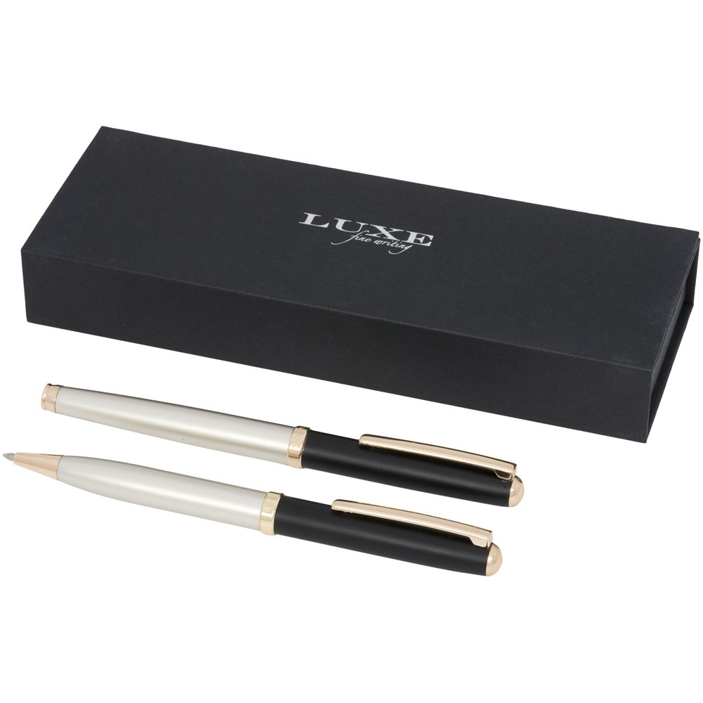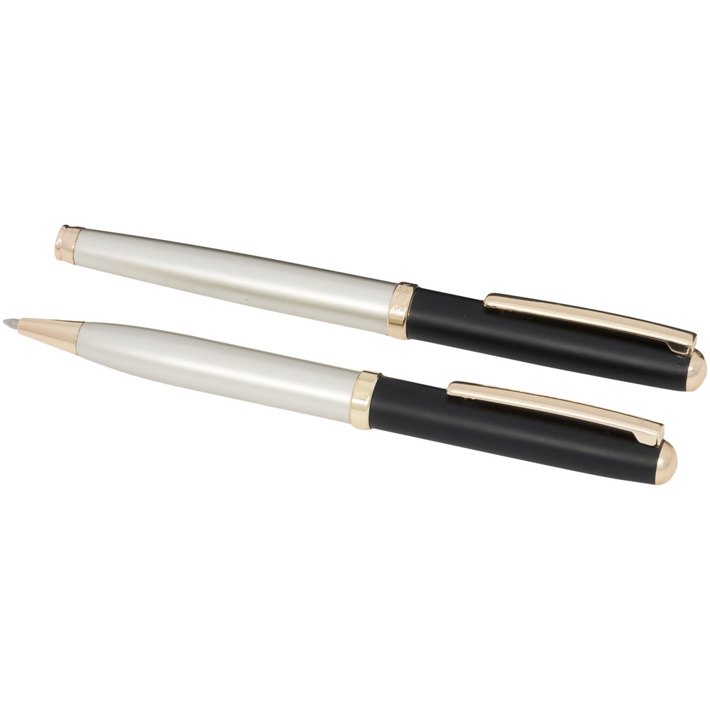 Ein modernes Schreibset bestehend aus einem Drehkugelschreiber und einem Kappentintenroller, das in einer Luxe-Geschenkbox geliefert wird. Alles mit einem mattgoldenen Schaft und glänzenden goldenen Teilen. Inklusive einer Premium-Nachfüllmine für beide Stifte. Oberer Teil des Schafts mit goldfarbener Unterschicht. Kugelschreibergröße: 13,4 x 1,05 cm, Gewicht: 23 g, Schreiblänge: 800 m. Tintenrollergröße: 13,5 x 1,05 cm, Gewicht: 23 g, Schreiblänge: 400 m.